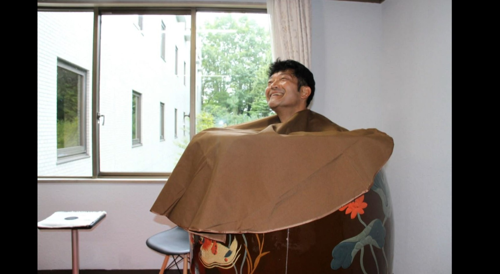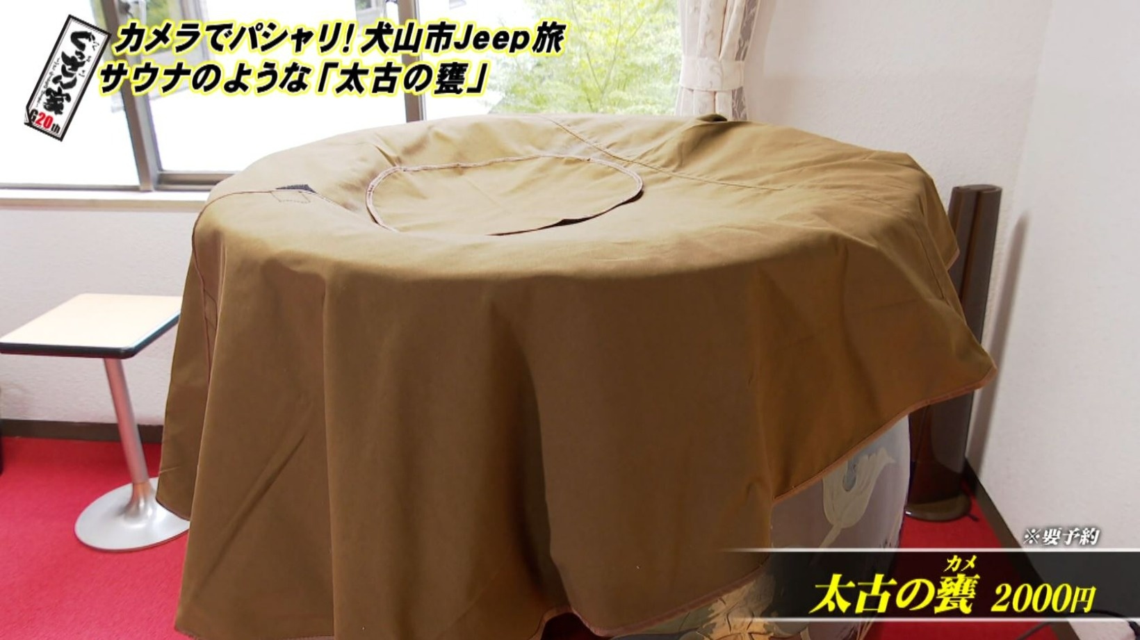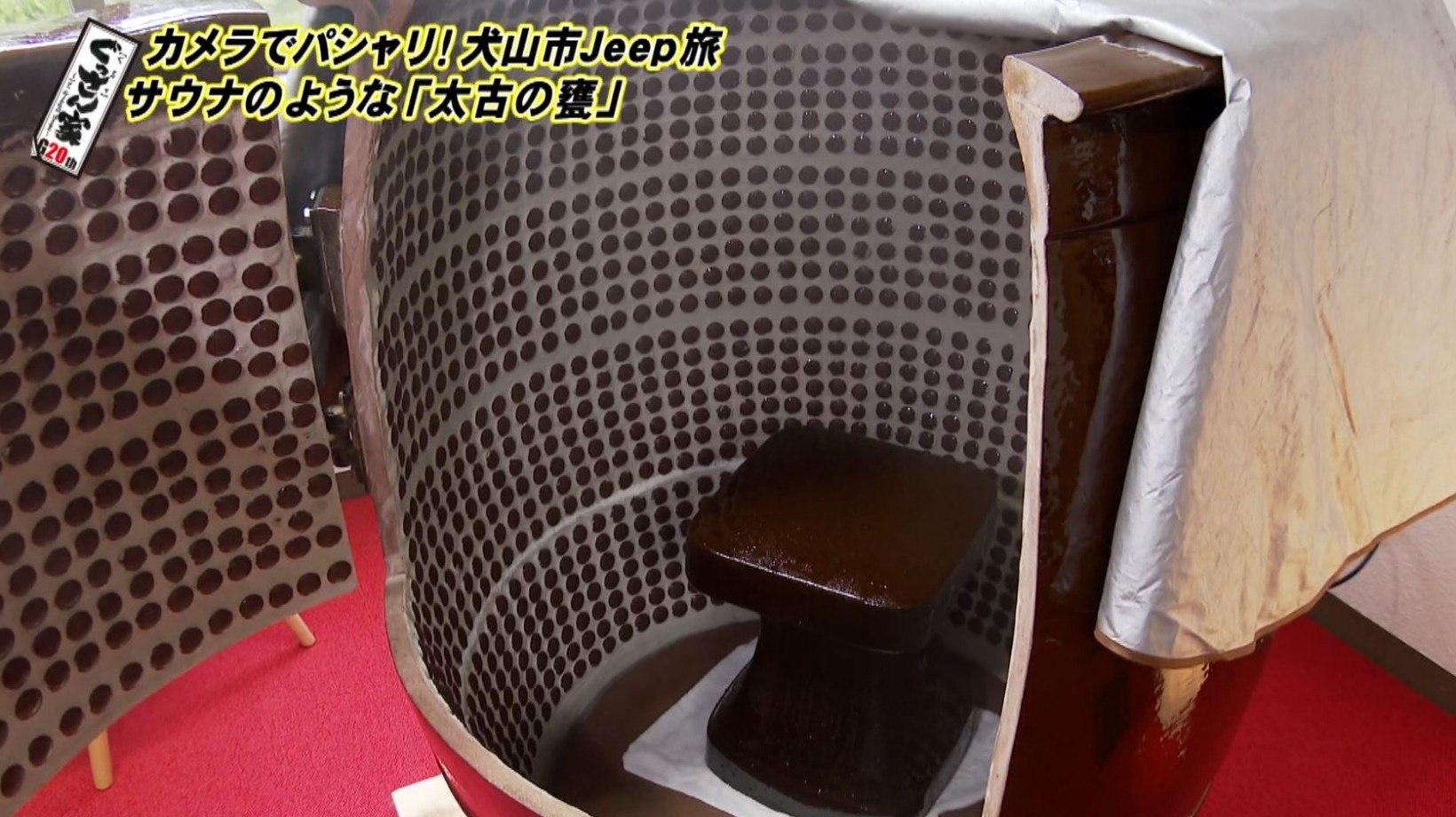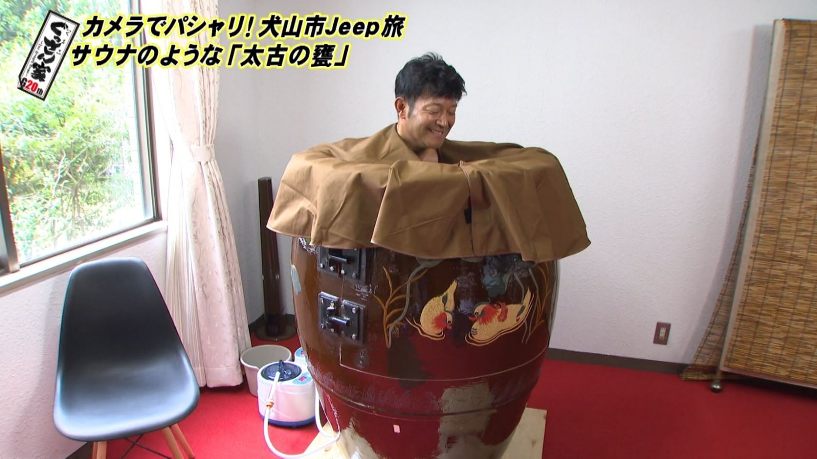 着替えを済ませ、甕の中に入って腰掛けると…みるみるうちに汗が噴き出してきます。「エッジの効いたグン!という熱さじゃないんですよ、スチームなんで、じわじわくる感じ!」と驚くぐっさん。鏡に映った自分の姿を見て「いま僕こんな感じなんや。『黒ひげ危機一発』ゲーム!飛び出すよ。そのうち」と苦笑い。