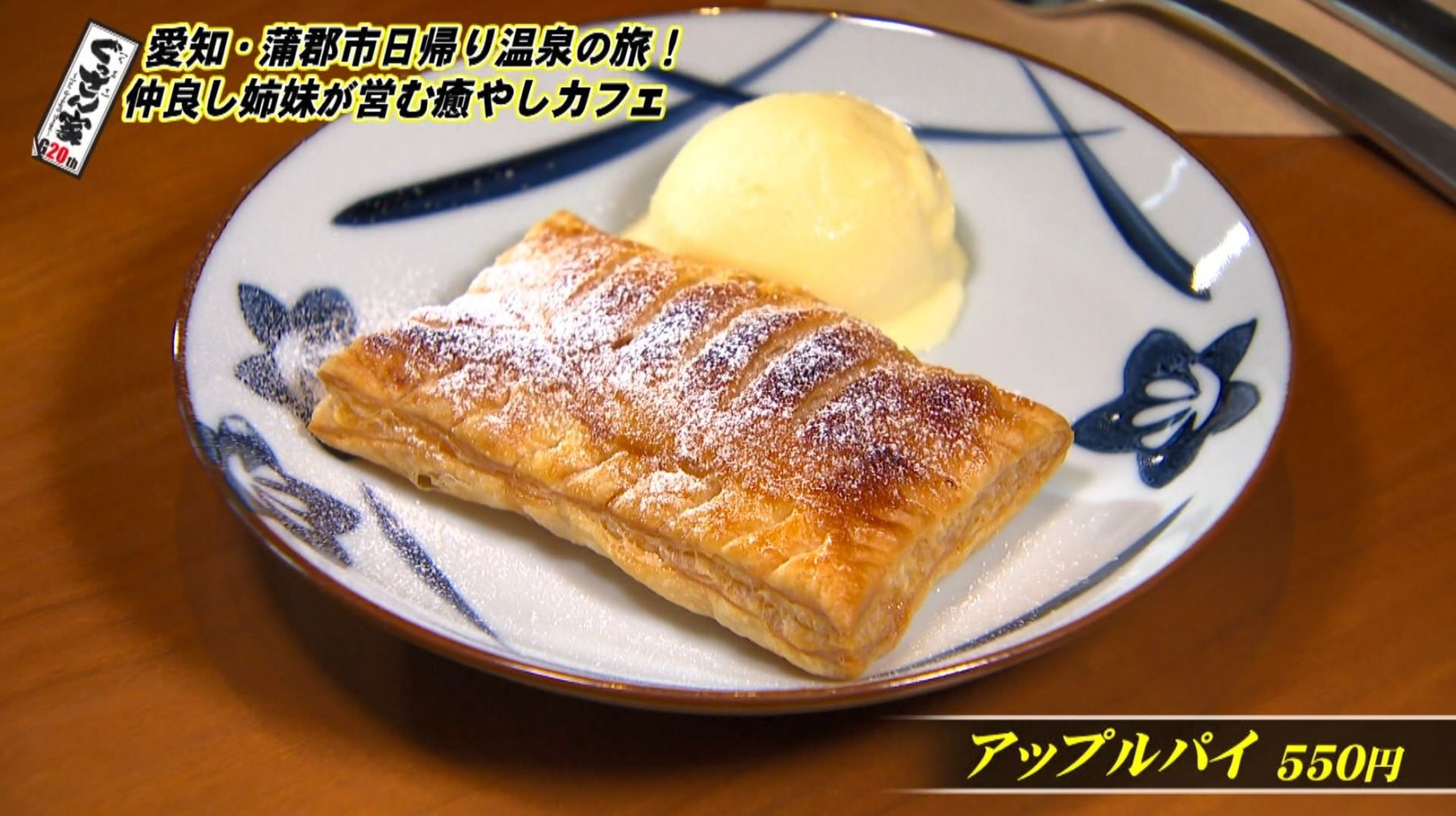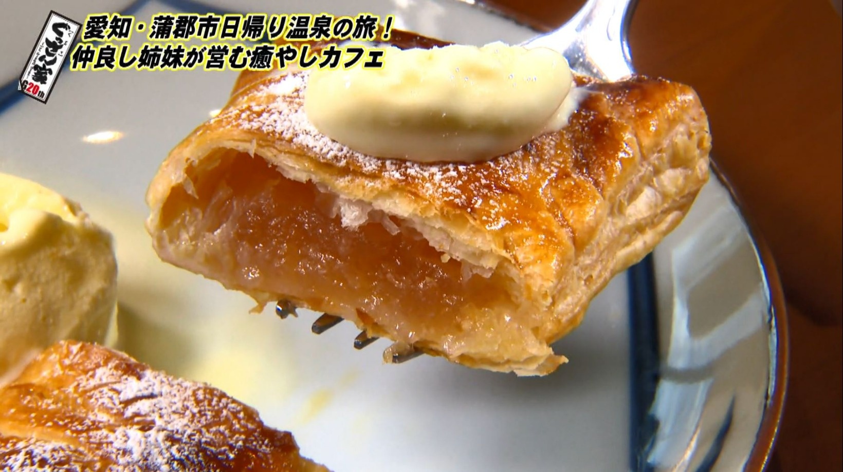 「サクサクパリパリの!うん、おいしい!中のリンゴジャムがすごいおいしい。全部のバランスがいいですよね」と大満足!「ここでくつろぎすぎて温泉忘れそう」とゆったりカフェタイムを過ごしました。