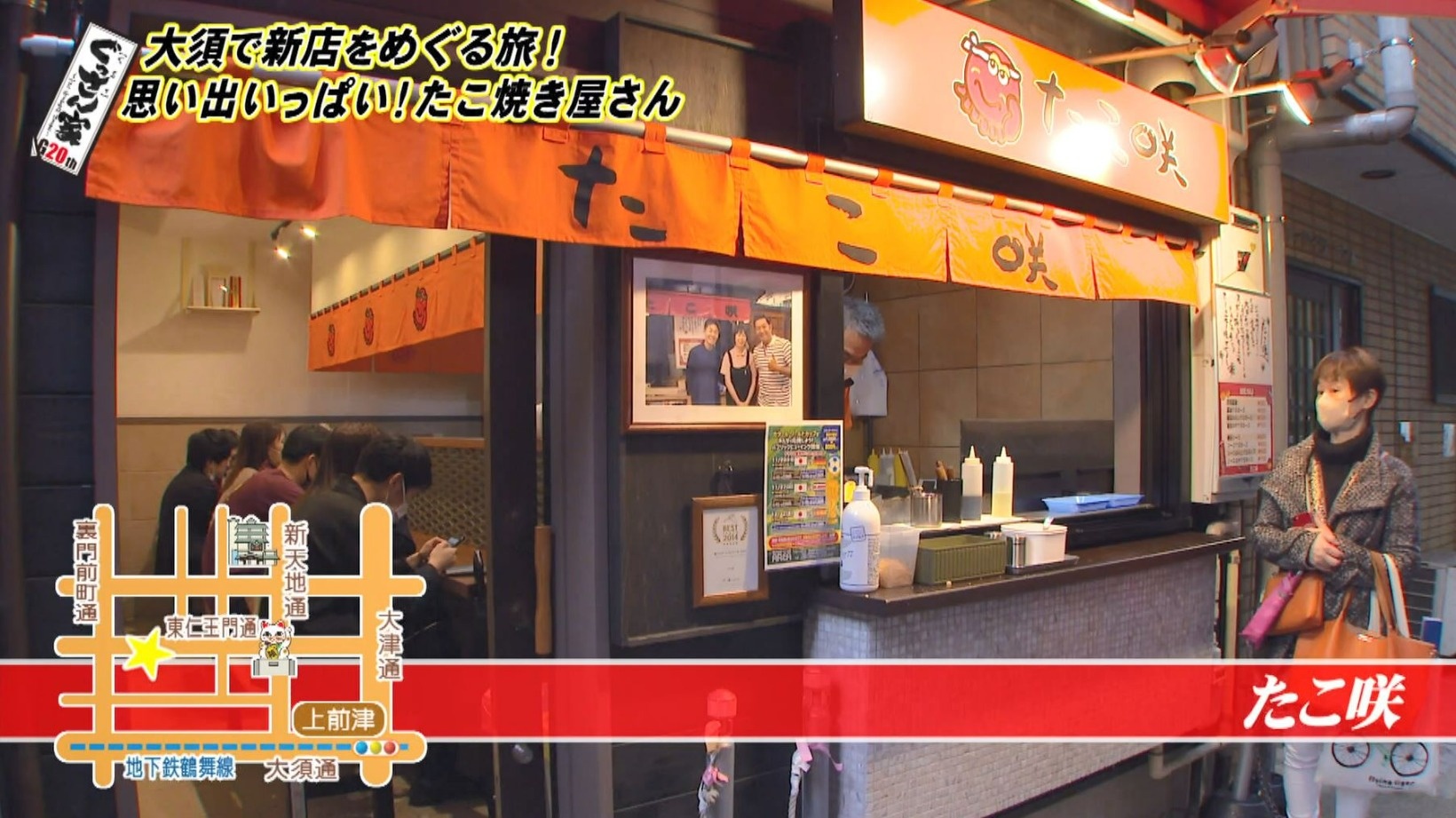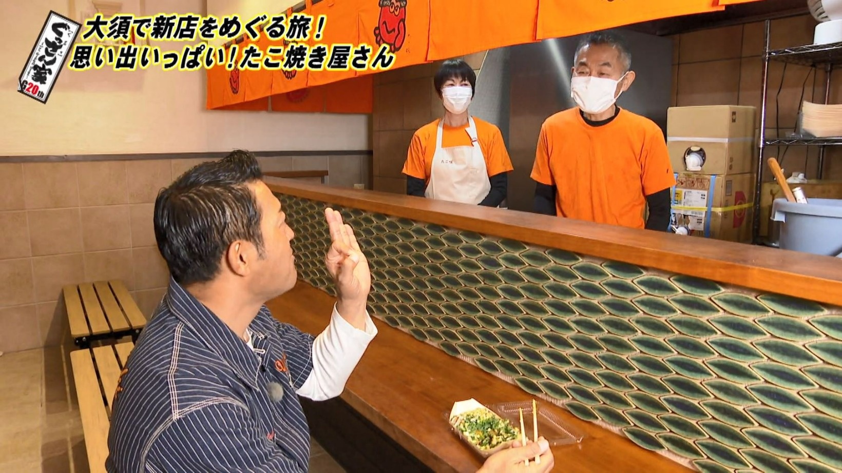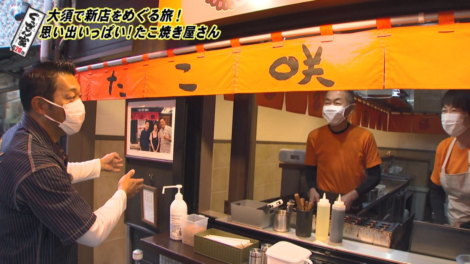 新しくオープンしたお店で大将の丸山さん夫妻にご挨拶。店先にはぐっさんと一緒に撮った写真が飾られていて「うちの宝ですから」という丸山さんに、ぐっさんも「ホンマですかぁ」と喜びます。