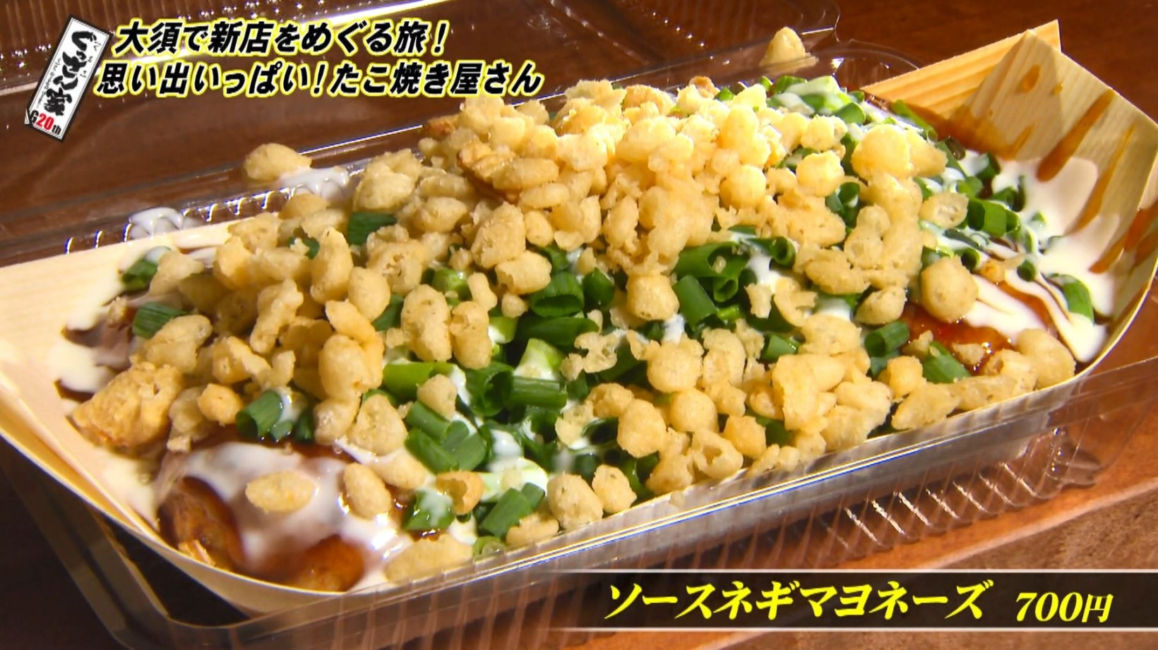 さっそく大好物のたこ焼き『ソースネギマヨネーズ』(700円)を注文。セルフサービスで天かすをかけて、店内でいただきます。