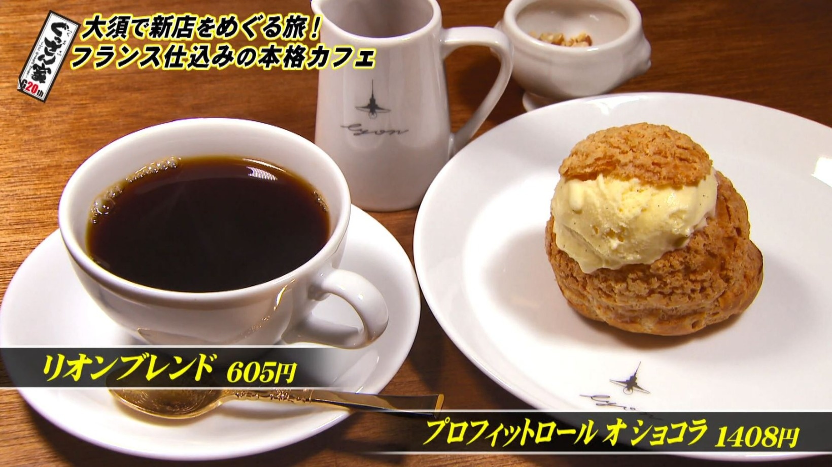 ぐっさんが注文したのは、コーヒーの『リオンブレンド』(605円)とパリのビストロの定番デザート『プロフィットロール オ ショコラ』(1408円)。