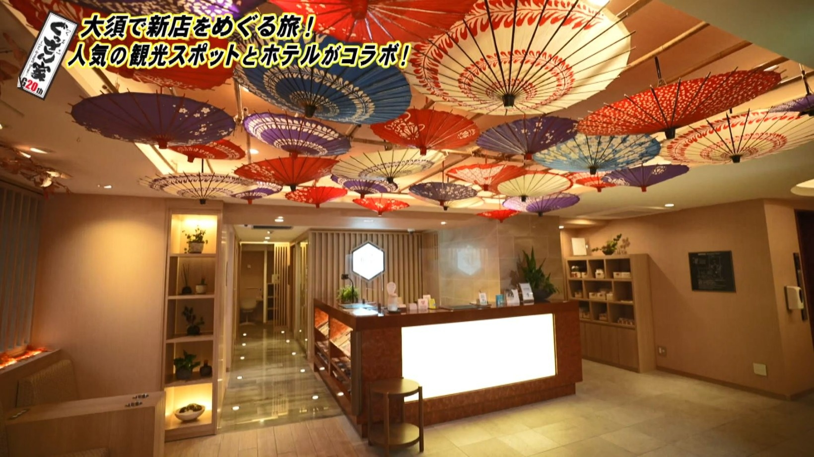 ロビーの天井には和傘が飾られていて「外国人の方とか喜ぶ感じかも」と興味津々。名古屋の観光名所とコラボした部屋が評判ということで、案内していただきます。
