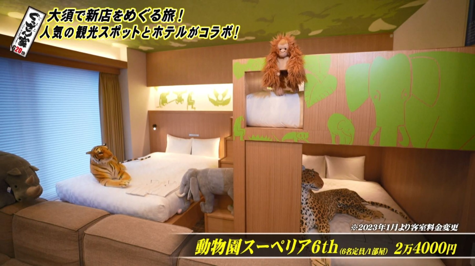 ゴリラが腕まくらをしてくれるユニークなクッションもあって、ぐっさんも「普段なかなか味わうことのないところで泊まれるのはいいですよね」と個性的なホテルを楽しみました。