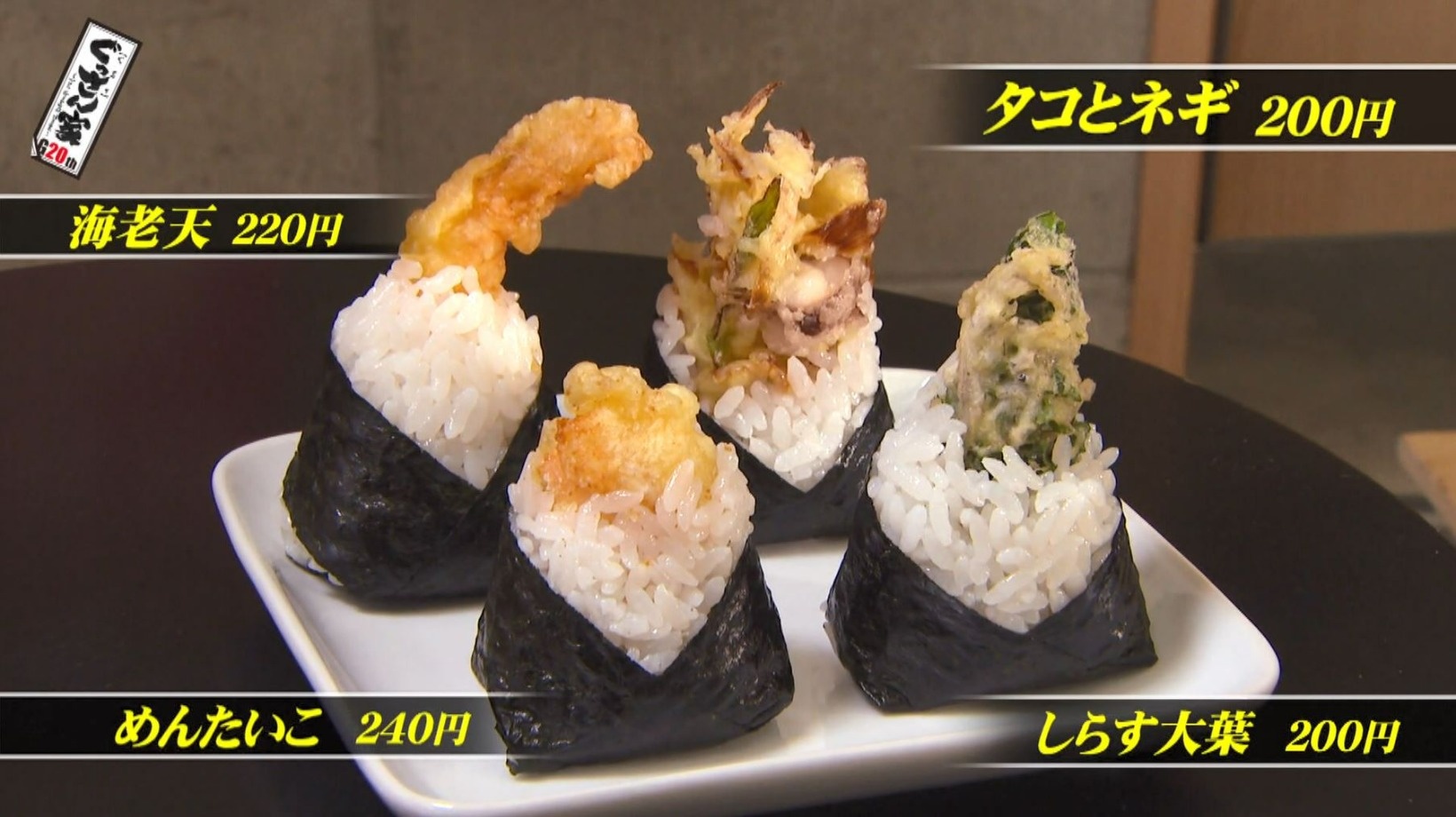 定番の『海老天』(220円)に、『めんたいこ』(240円)、『タコとネギ』(200円)、『しらす大葉』(200円)などオリジナリティーあふれるラインナップ!多い日には13種類が楽しめます。