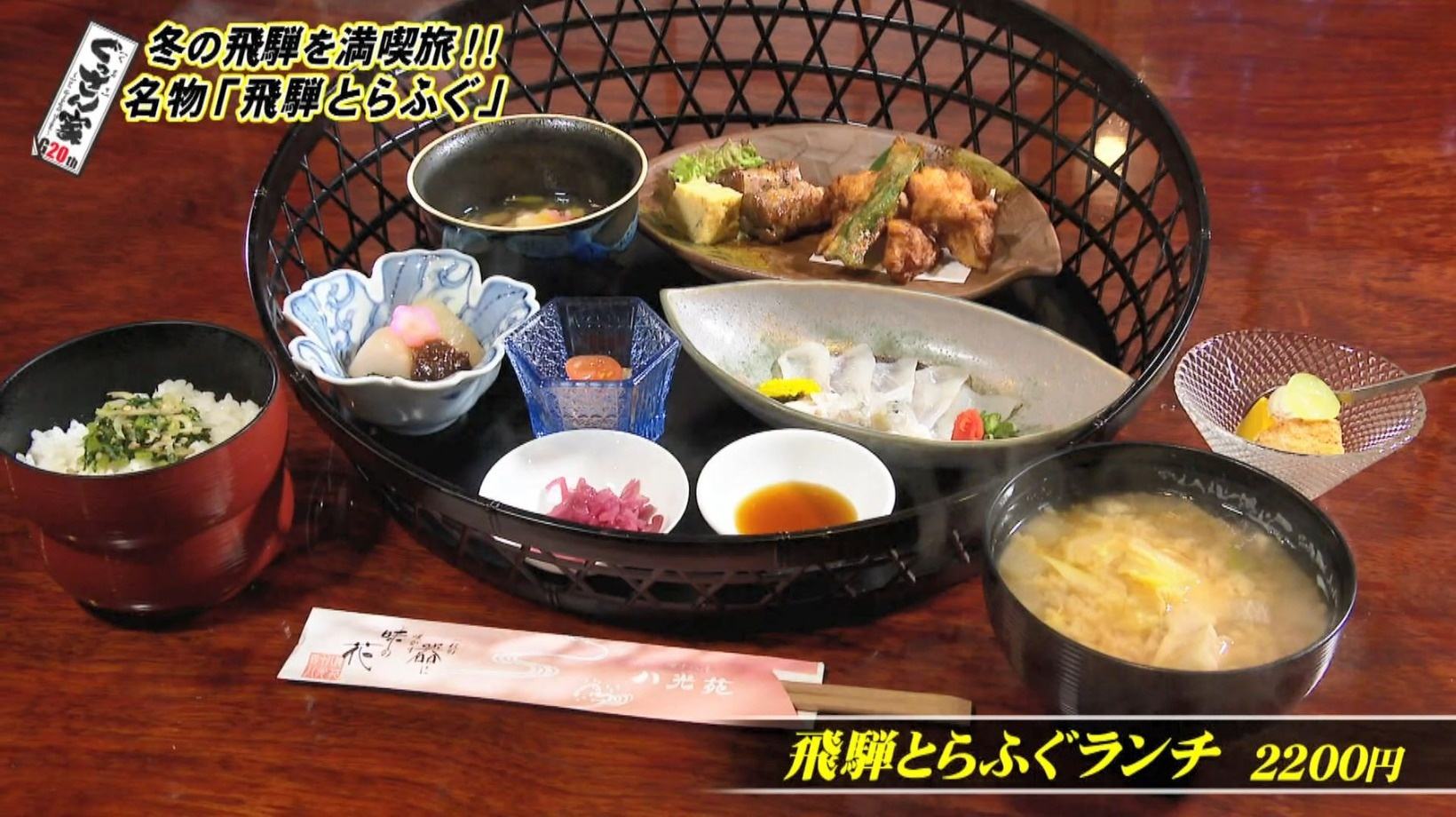 ぐっさんが注文したのはお値打ちな『飛騨とらふぐランチ』(2200円)。てっさや唐揚げなどのふぐ料理に、飛騨ならではの山の幸も楽しめる全9品。