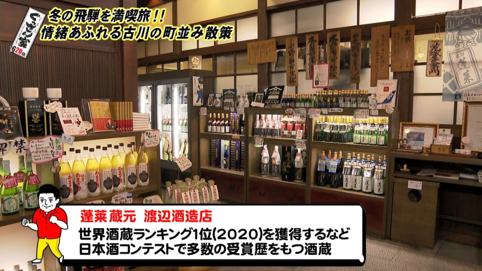 さらに町を散策し「渋いね!あの杉玉。しめ縄かかっている杉玉初めて見た」と軒下の立派な杉玉を見つけて立ち寄ったのは『蓬莱 蔵元 渡辺酒造店』。世界酒蔵ランキング1位(2020)など、日本酒コンテストで多くの受賞歴をもつ酒蔵です。