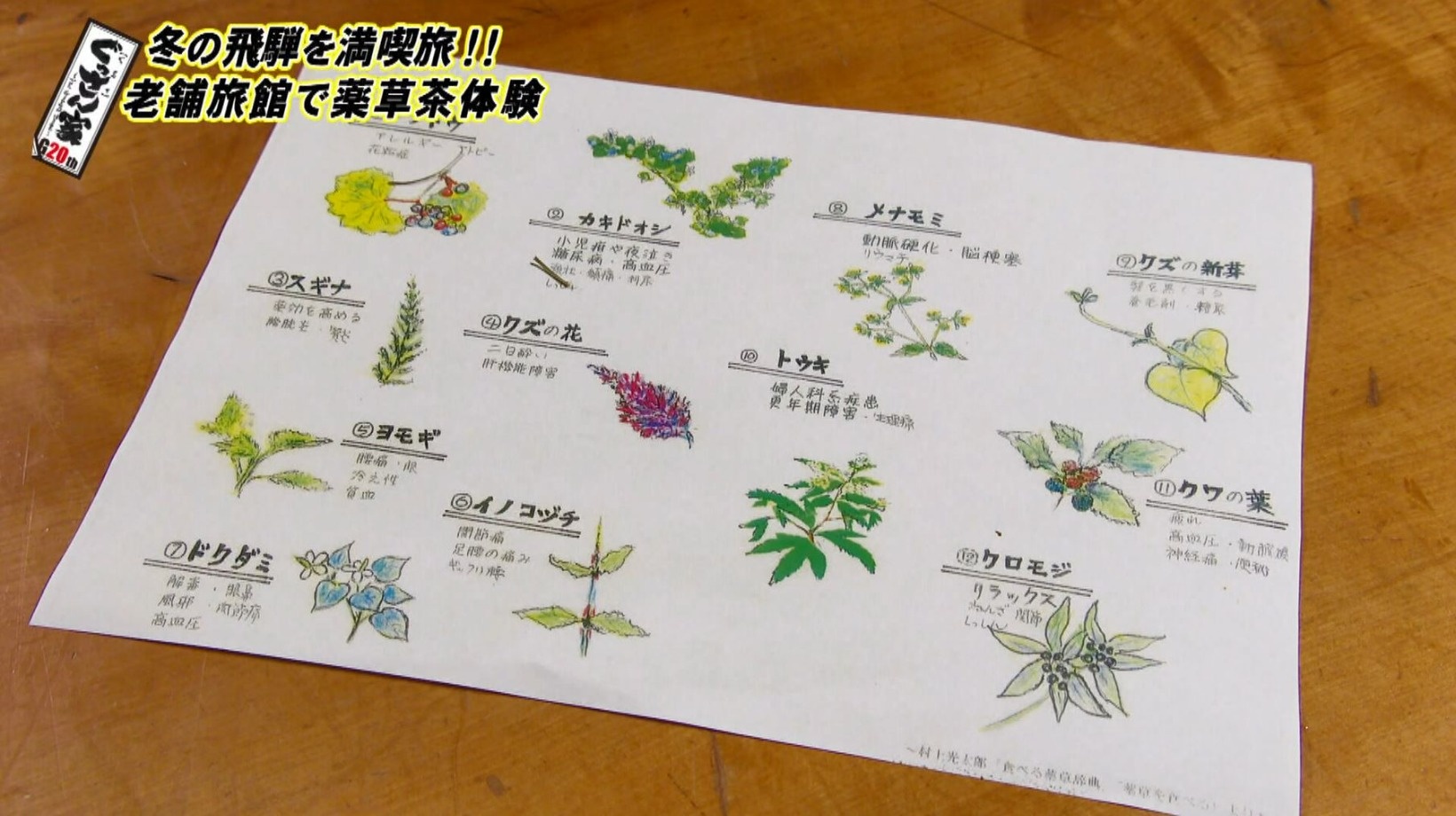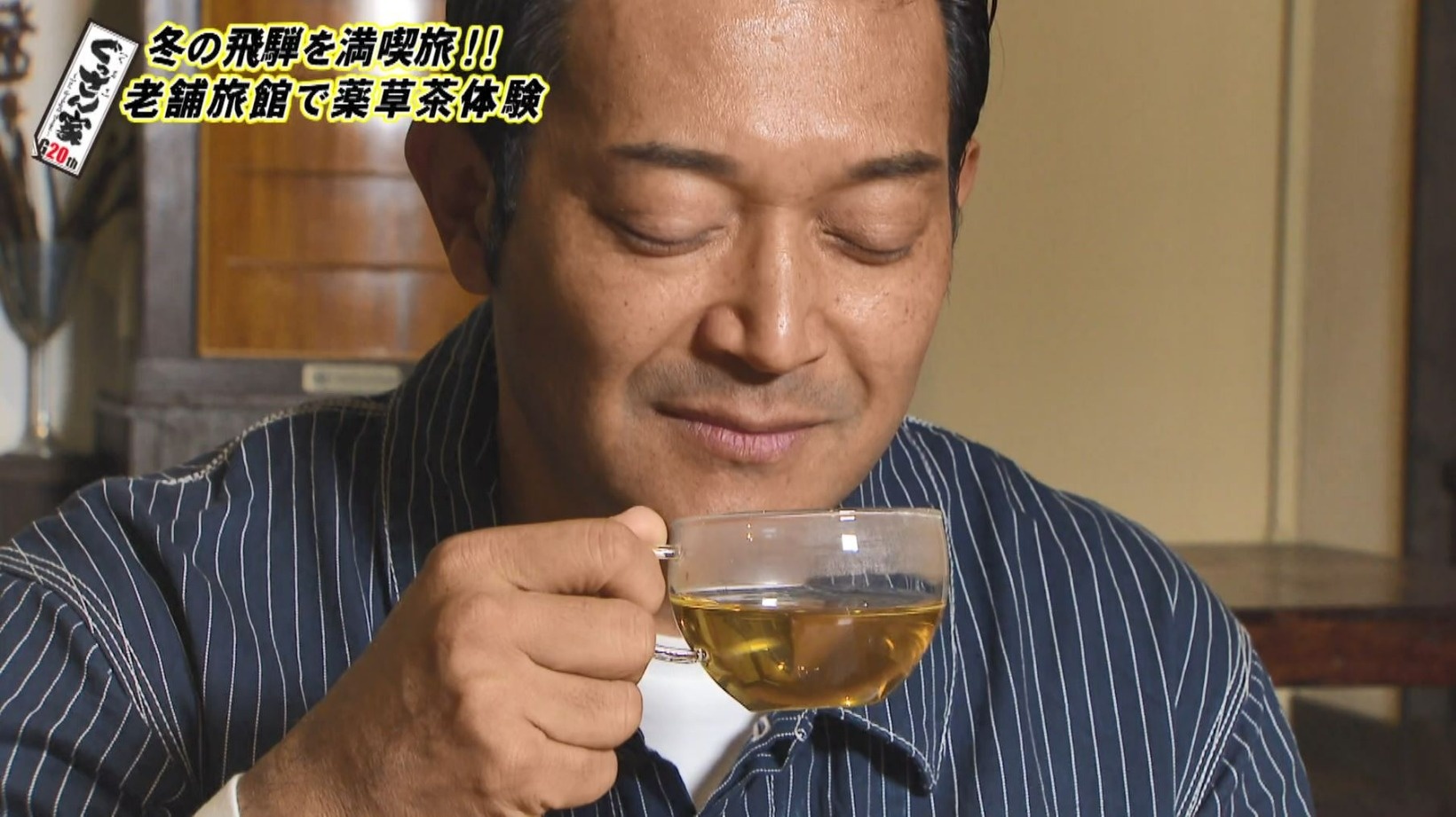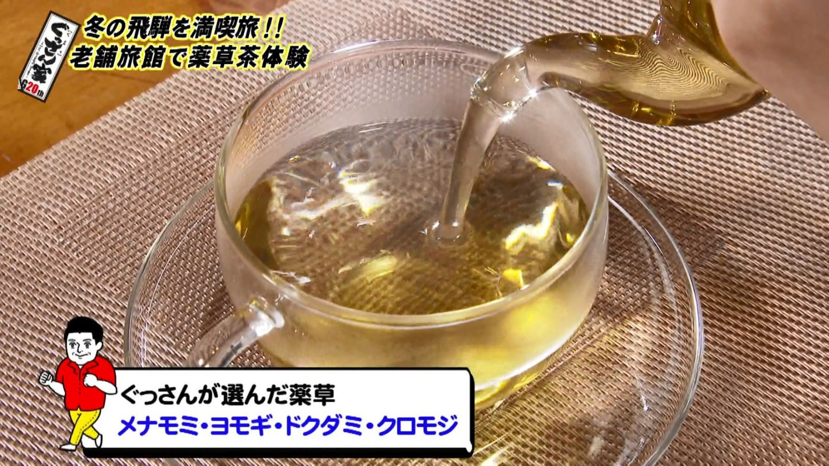 ぐっさんが選んだのはメナモミ、ヨモギ、ドクダミ、クロモジの4種類。マイブレンドの薬草茶をいただき「おいしい!爽やかでちょっとフルーティな感じもするし、薬草の独特な味わい…やっぱり香りですよね」としみじみ。
