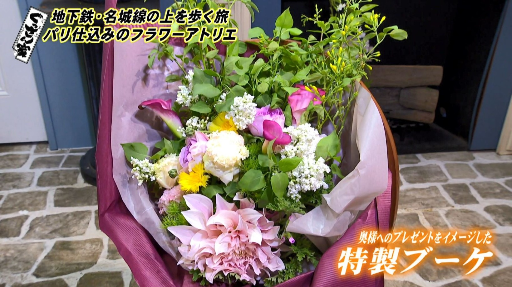 ここで渡邉さんが作ってくれたのが「ぐっさんから奥様へプレゼント」をイメージした特製ブーケ。大ぶりなピンク色のダリヤで「奥様の優しい太陽のイメージ」を表現。パリ仕込みのセンスが光るナチュラルで素敵なブーケです。