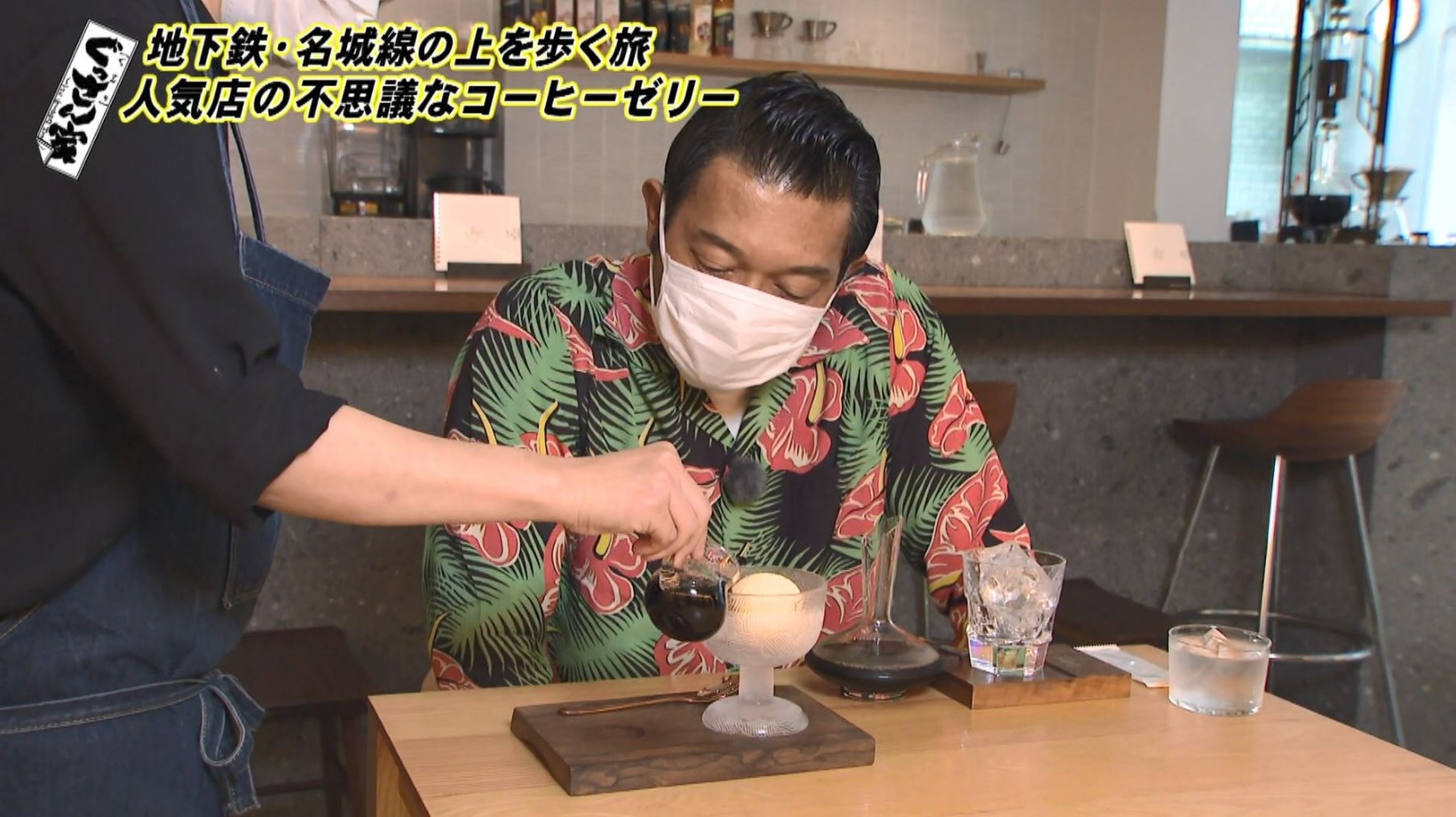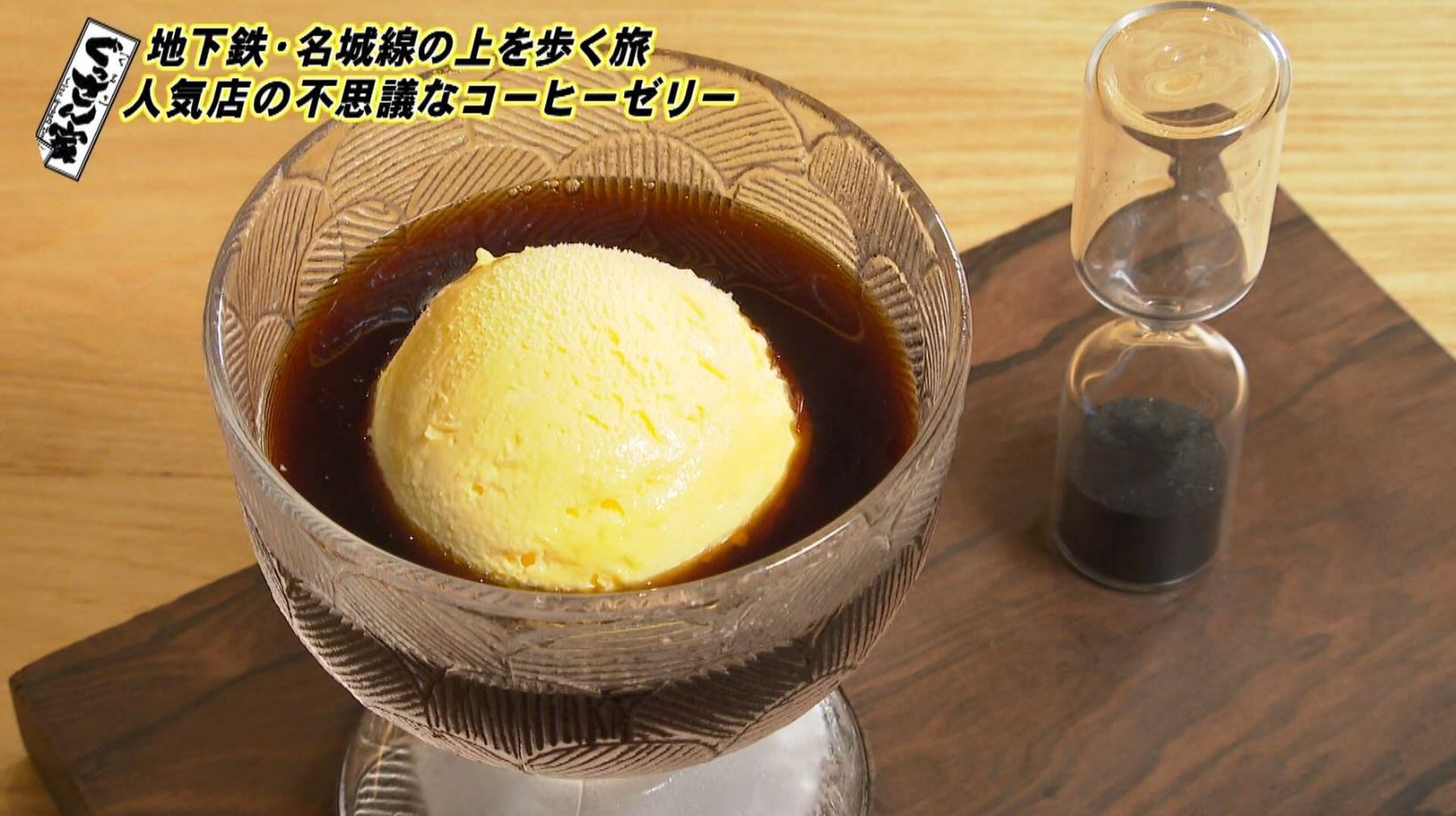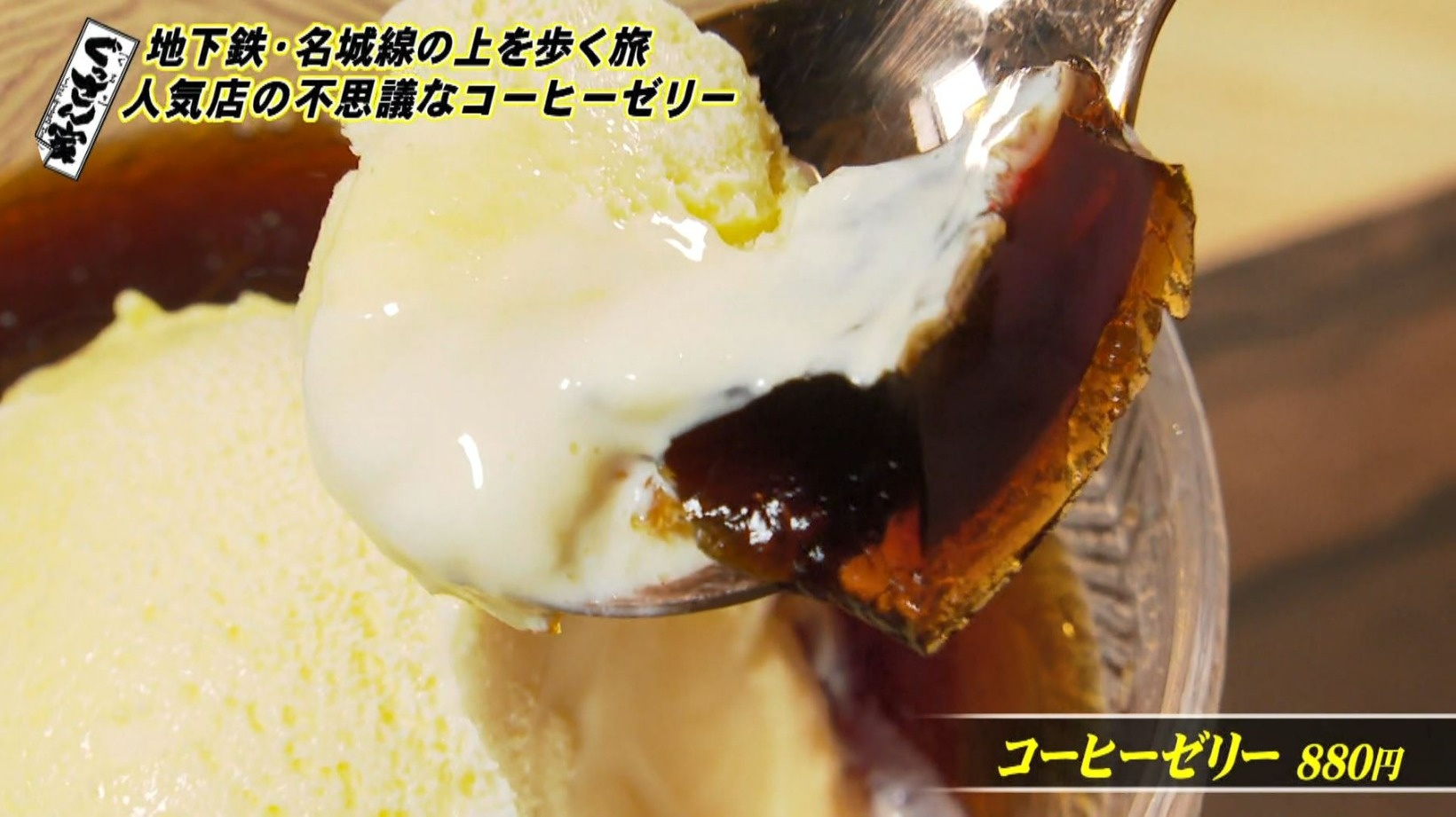 続いてお待ちかねの『コーヒーゼリー』(880円)をいただきます。よく冷えたグラスにはバニラアイスが入っていて、そこにコーヒーを注ぎます。「これがプルンプルンした感じになるんですか?なんでやろ?」と不思議がるぐっさん。3分待つと…
