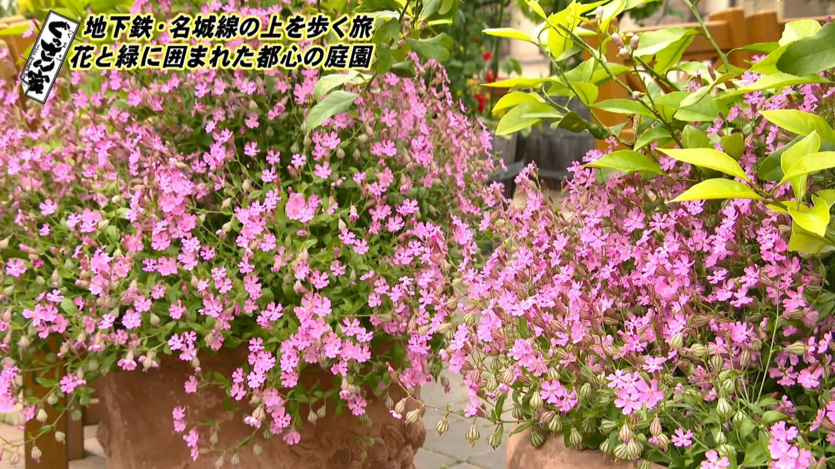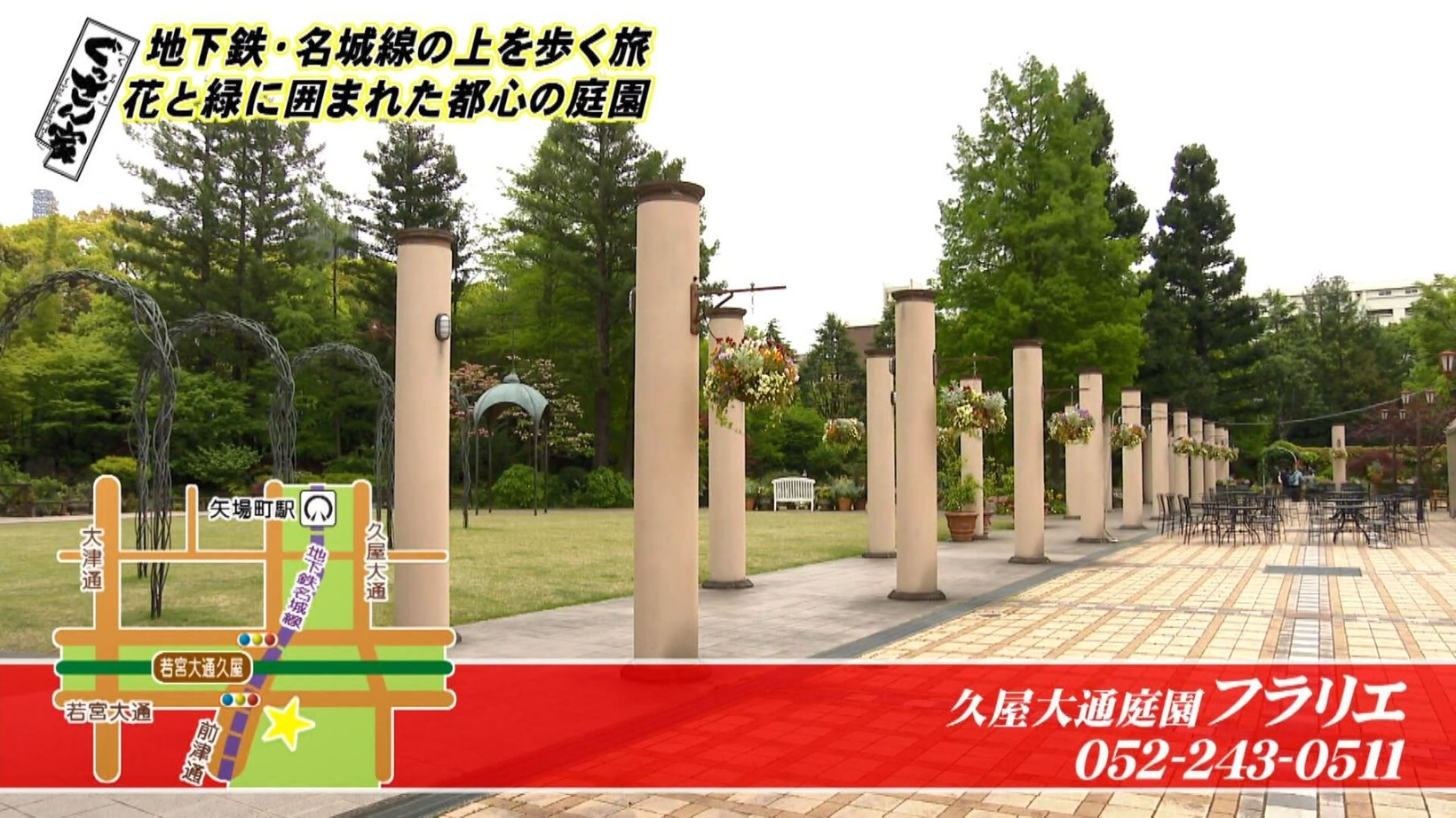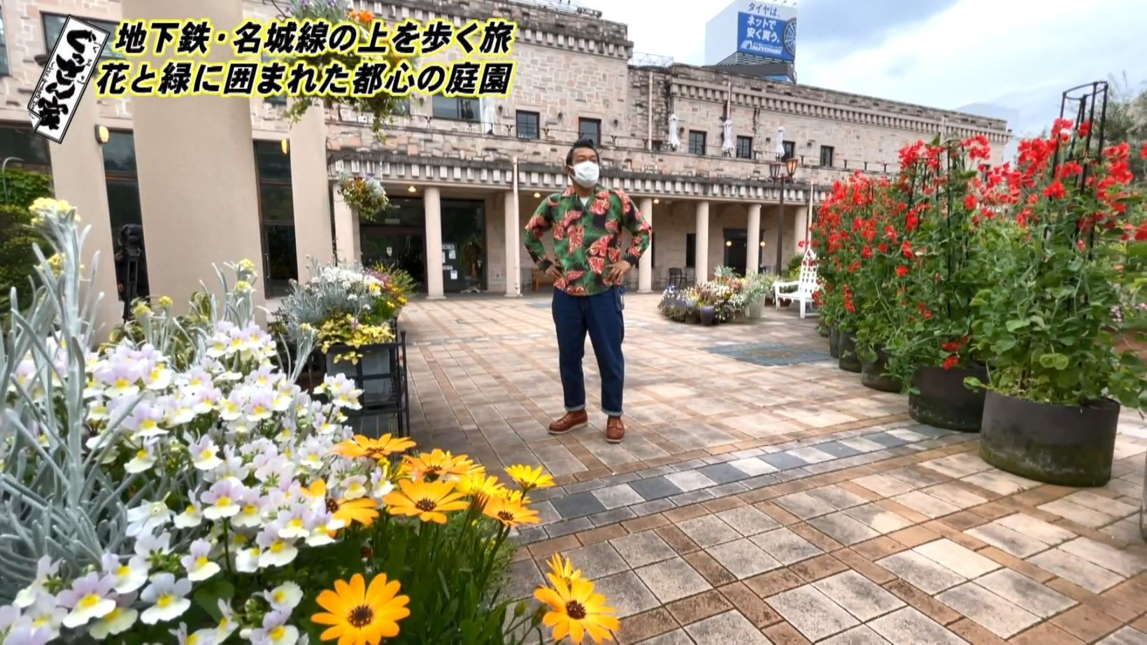 続いて立ち寄ったのは『久屋大通庭園 フラリエ』。入場無料の庭園には季節の花が咲き誇り、四季折々の表情が楽しめます。「今日は花つながりですね~」とテンションが上がるぐっさん。