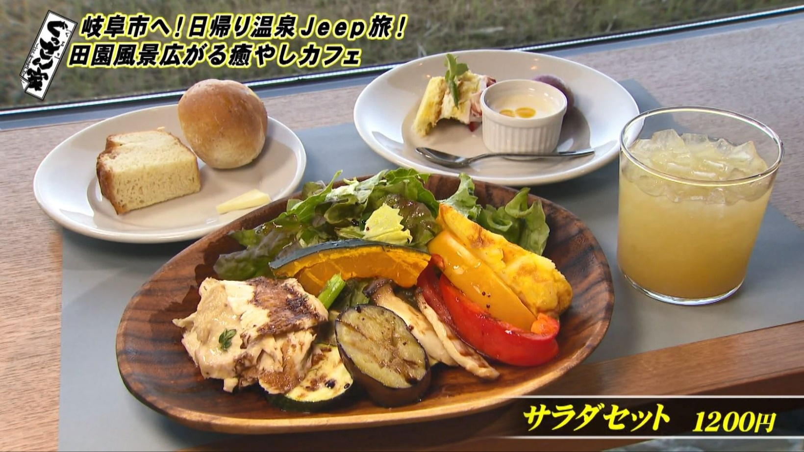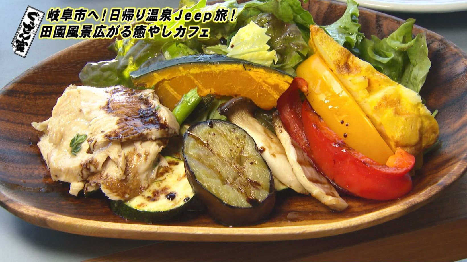 ぐっさんが注文したのは野菜たっぷりの『サラダセット』(1200円)。ズッキーニやパプリカなど、旬の地元野菜を使った彩り豊かな一皿です。野菜は焼き目がつくまで火を通して甘みを引き出しています。