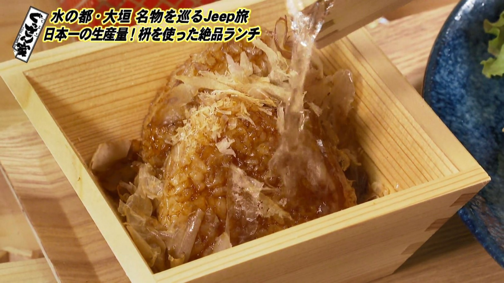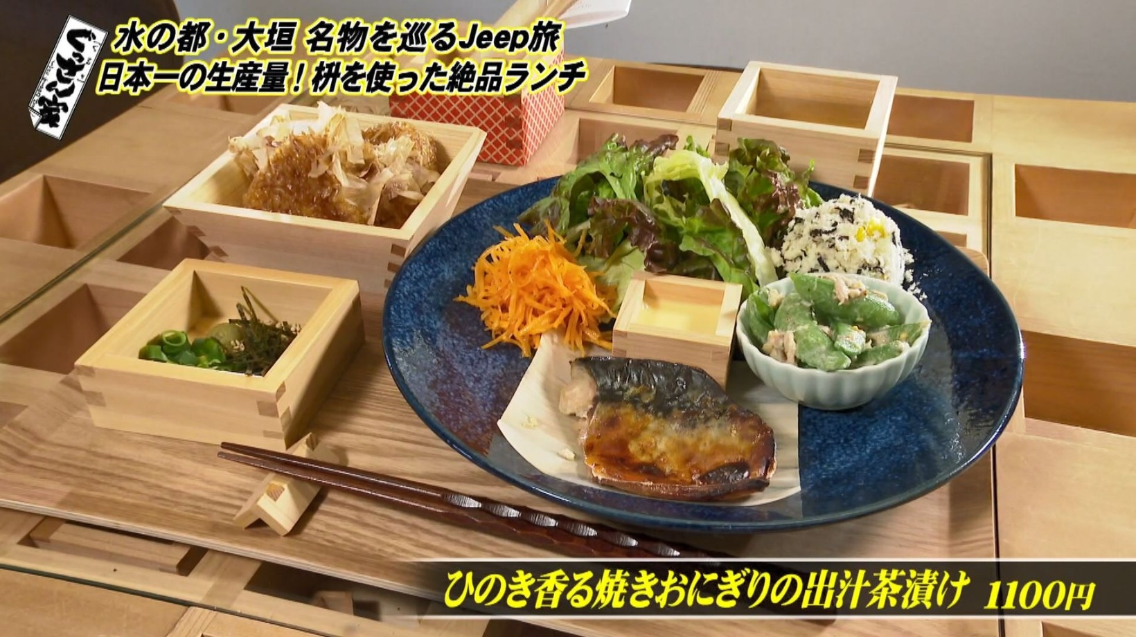 ぐっさんが注文したのは『ひのき香る焼きおにぎりの出汁茶漬け』(1100円)。焼きおにぎりやサラダのドレッシングの器など、ふんだんに枡が使われています。
