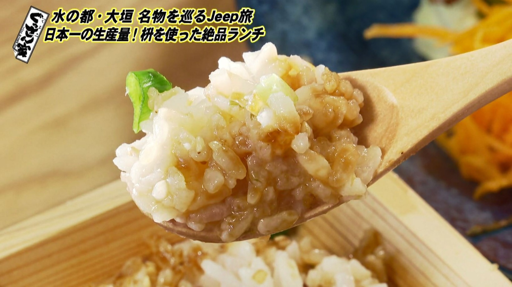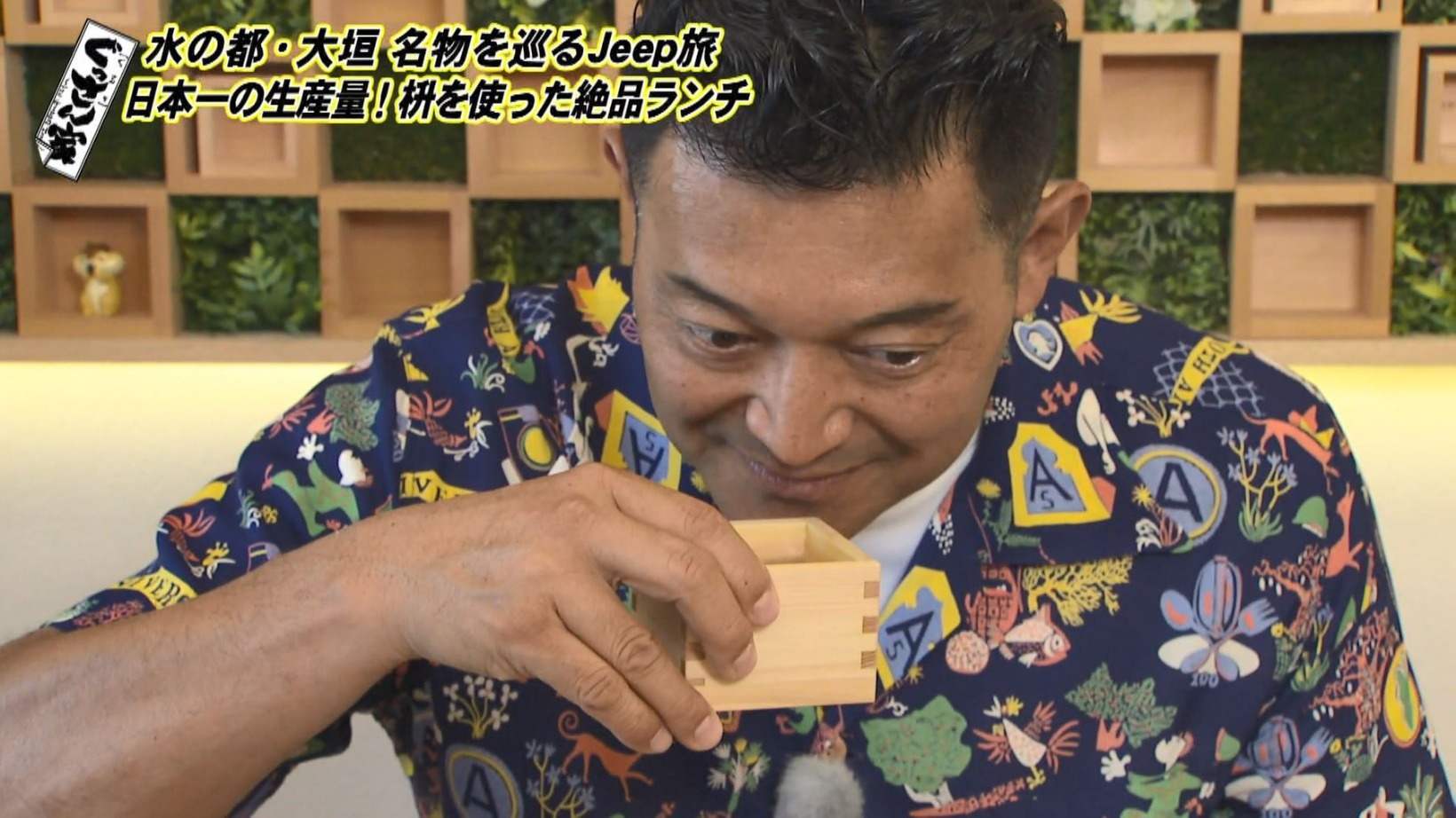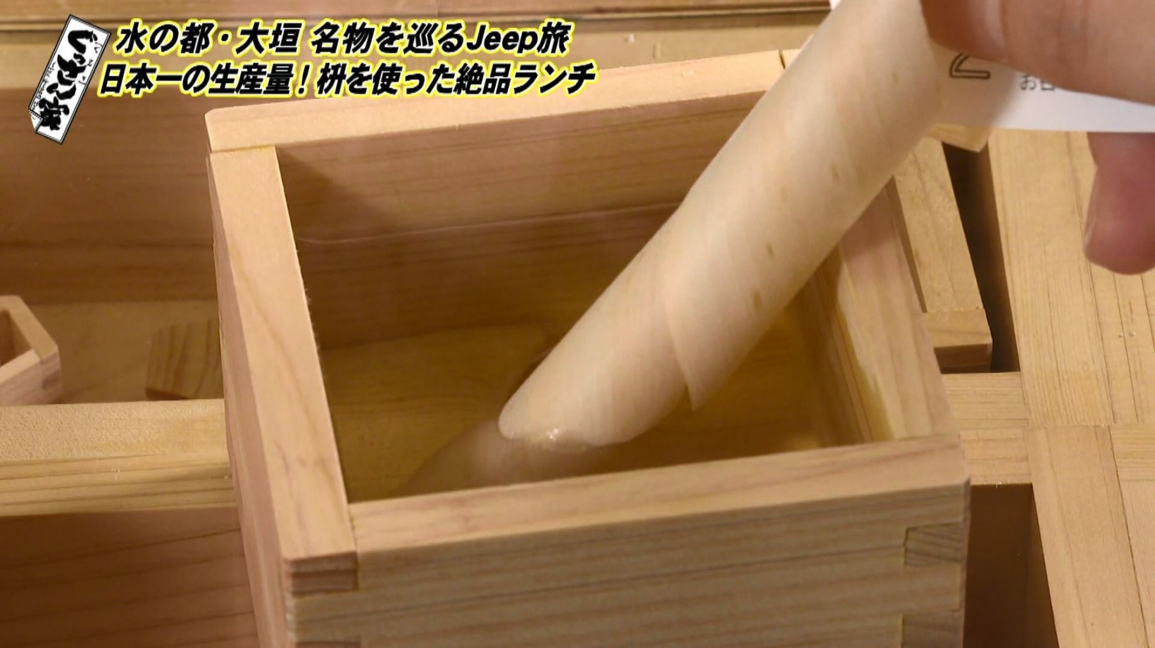 ぐっさん、上品なひのきの香りを楽しみつつ焼きおにぎりをいただき「おいしいです!初めてですね。枡で食べるって。汁物入れても絶対に漏れないという技術なわけじゃないですか」と枡の器に感激します。