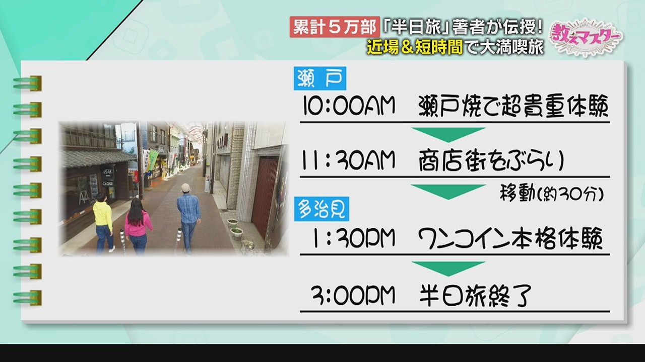教えてくれるのは、世界90か国を旅する旅行作家の吉田友和さん。半日旅をテーマにした本は、シリーズ累計で発行5万部。名古屋版も発売され、新書部門で売上1位を記録している“半日旅マスター”に、ガンバレルーヤの2人が魅力を教わります。