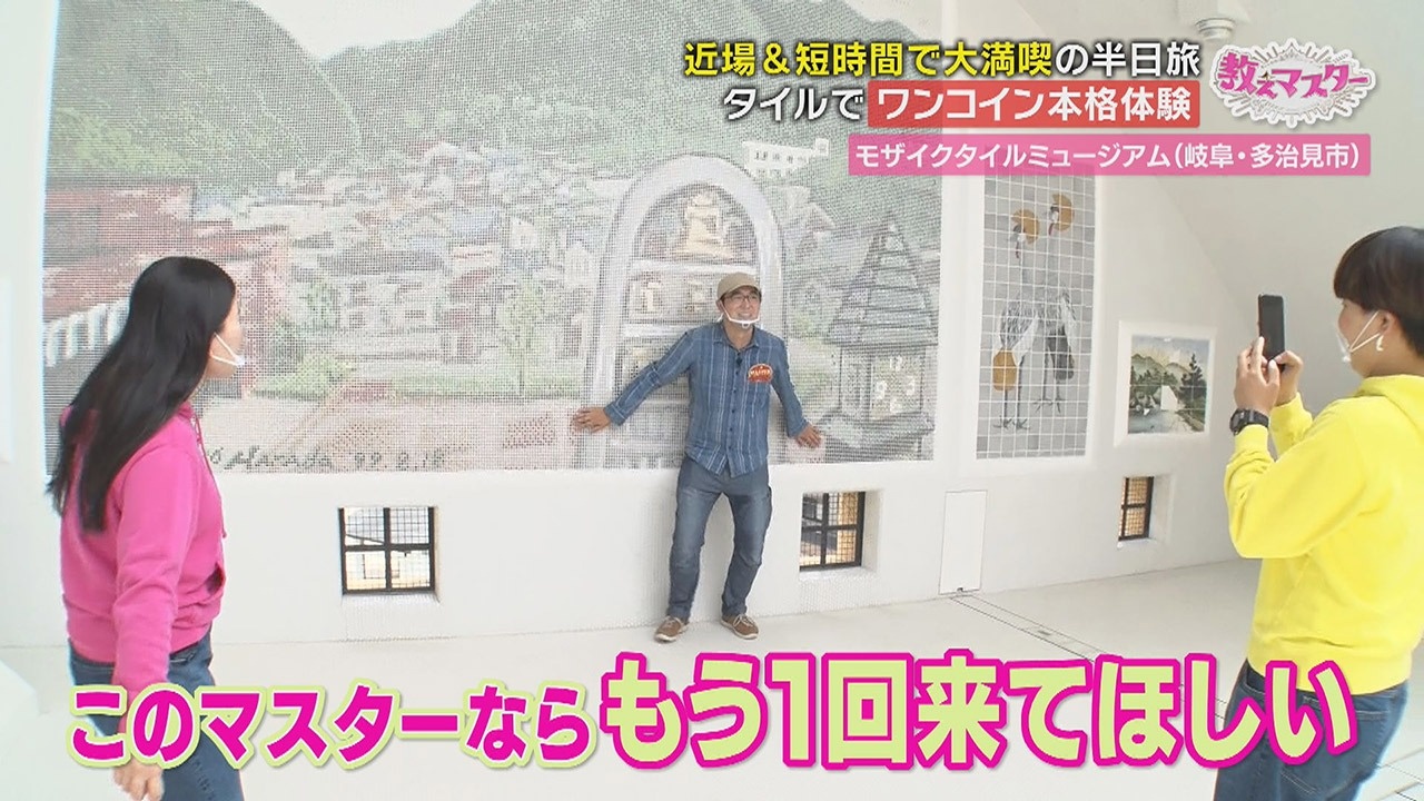 マスター:次は車で30分移動して、多治見市へ。多治見市笠原町はモザイクタイル生産量が日本一です。【多治見市モザイクタイルミュージアム】は、数々のモザイクタイル作品を展示していて、SNS映えで話題のスポット。すごく面白いタイル装飾が出来ますよ。好きな小物を選んでタイルで飾る『体験工房 ワンコイン工作(予約制/500円)』です。