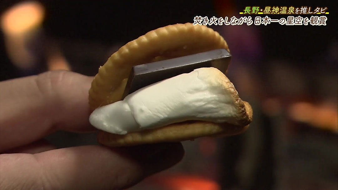 串に刺したマシュマロに焼き目をつけ、チョコレートと一緒にクラッカーに挟んだ“スモア"を味わいながら夜空を見上げるのも楽しみのひとつです。