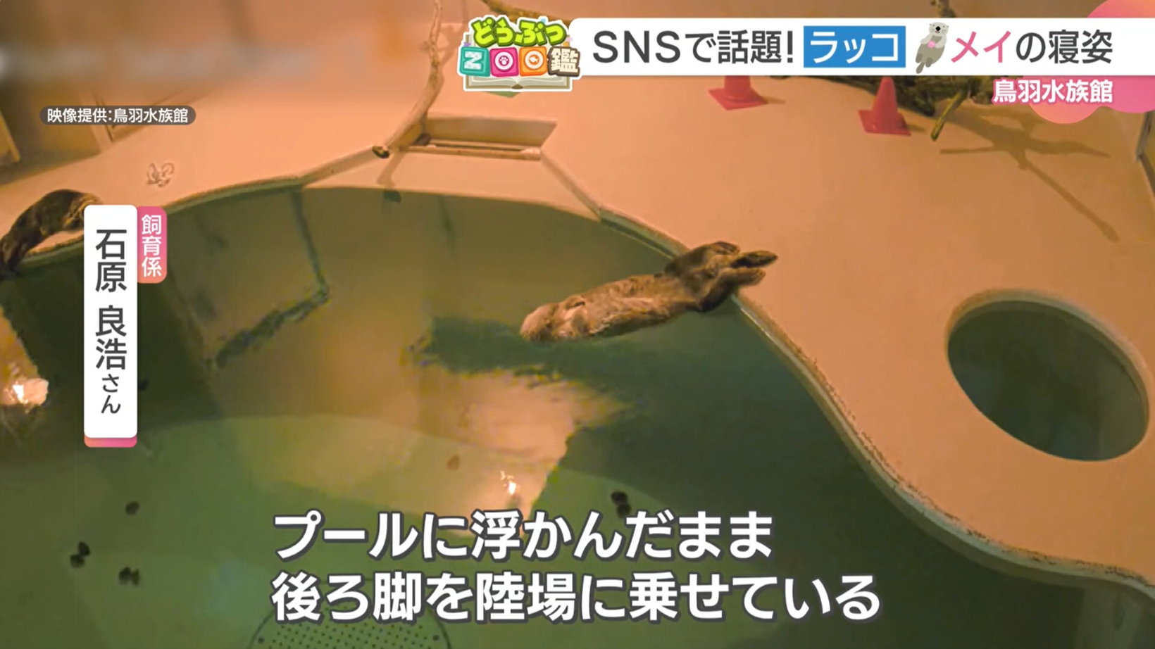 その寝方とは、プールに浮かんだまま、後ろ足を陸場に乗せて眠る姿。飼育係・石原さんは、「プールには水の流れがあるので、後ろ脚を陸場に乗せて、流れていかないように固定している」と話します。
