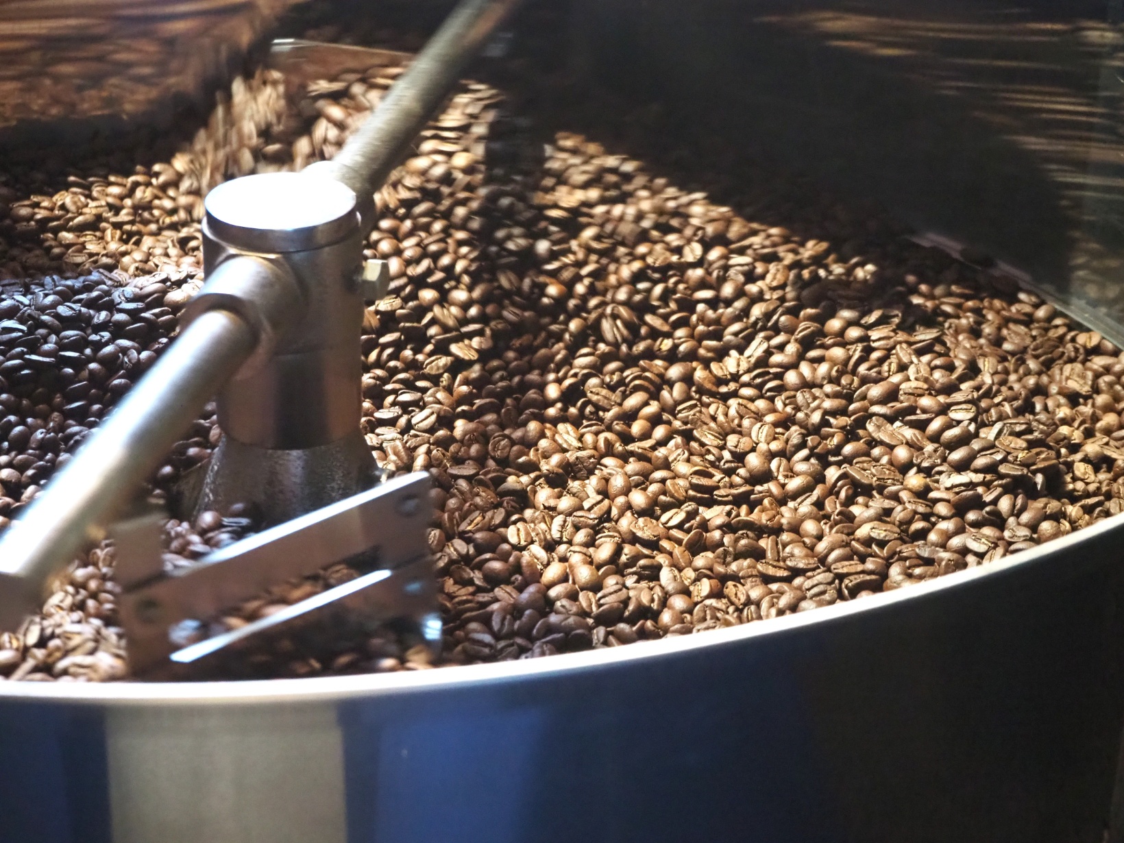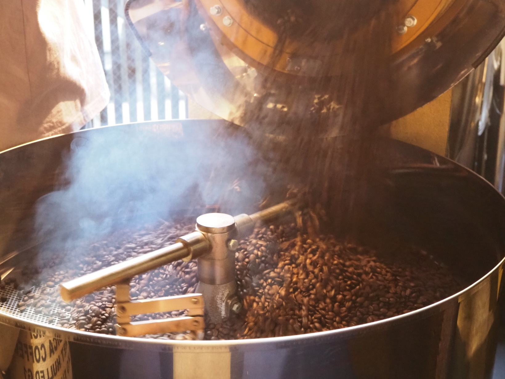 焙煎後、勢いよく飛び出してくるコーヒー豆!熱を帯びたコーヒーの香りが室内いっぱいに広がります。