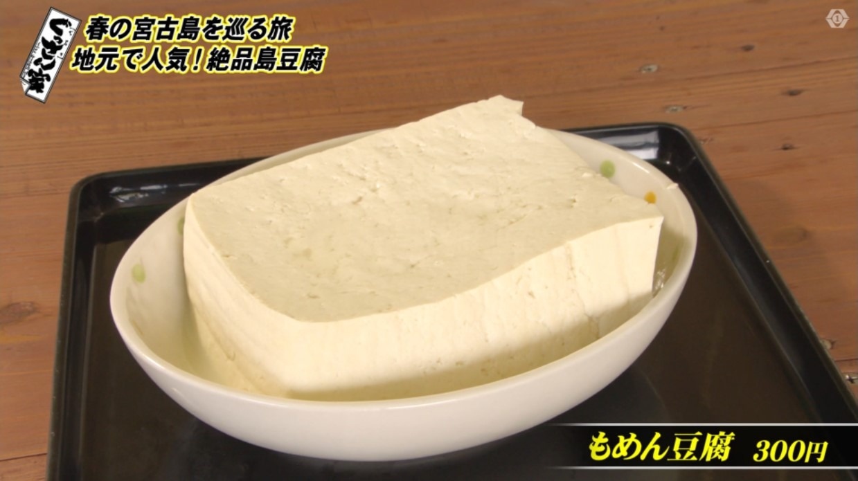 にがりの代わりに海水を使って豆乳を固める、島ならではの製法で作られた「もめん豆腐」(300円)、醤油は付けず、そのままいただきます。