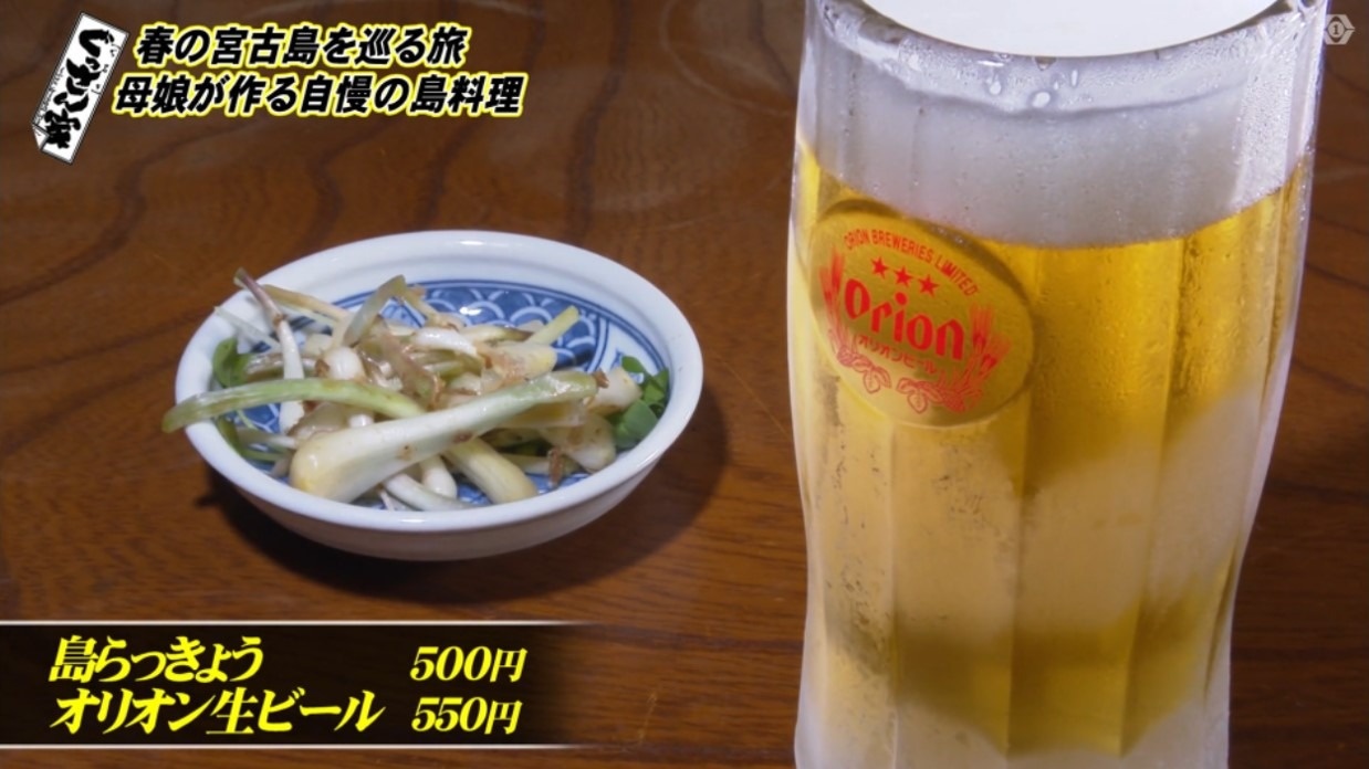 まずは「オリオン生ビール」(550円)と「島らっきょう」(500円)で乾杯!