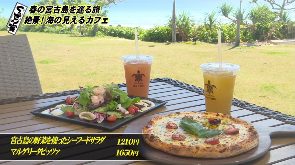 美しい海を見渡すテラスが自慢のカフェで、宮古島産の野菜を使ったサラダやピザ、南国のフルーツを使ったスイーツがいただけます。