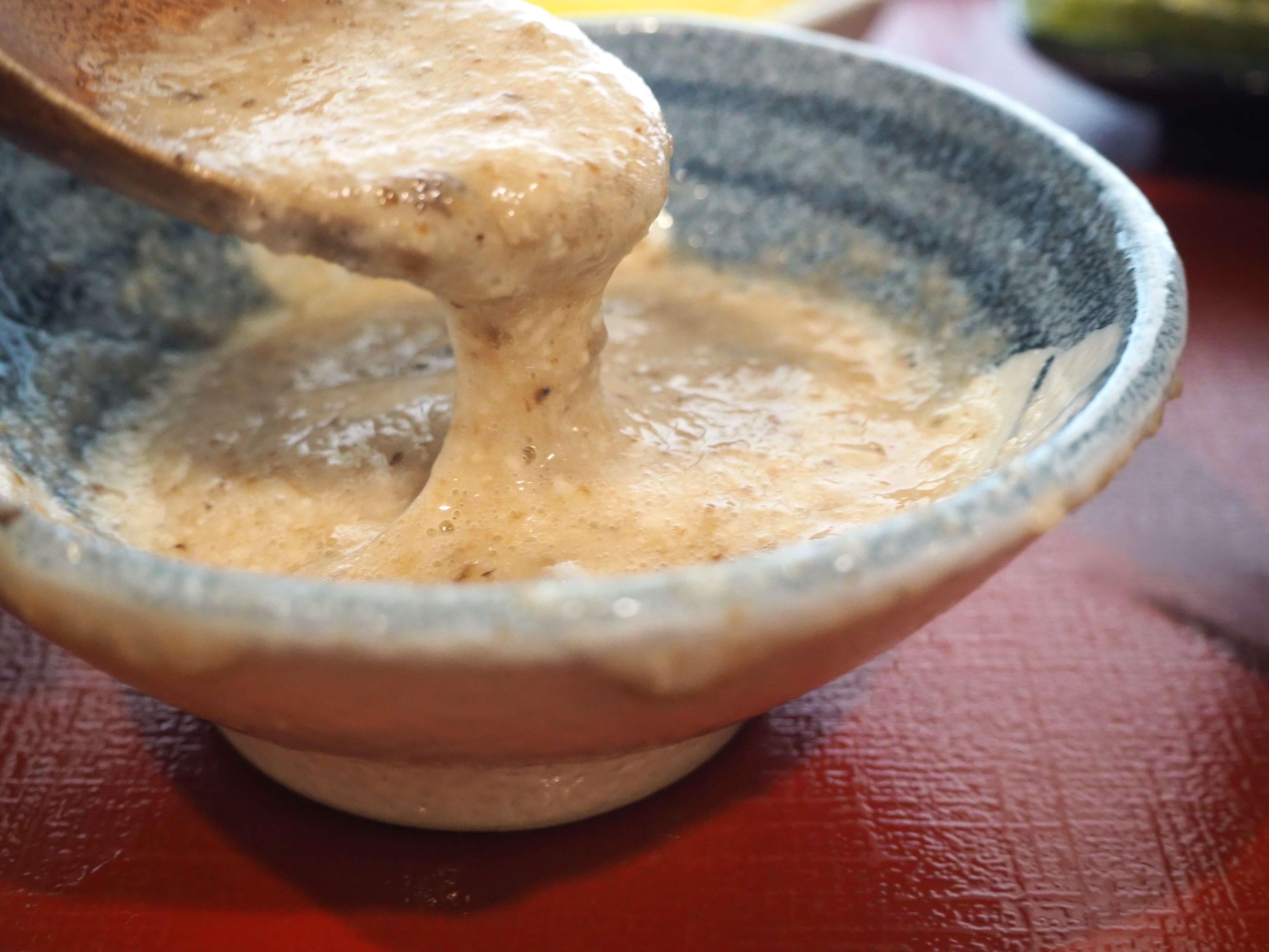 麦飯にたっぷりかけると、自然薯の粘りと出汁の風味が口いっぱいに広がり、そばに絡めれば、つるりとしたのどごしに変化。薬味で香りや味にアクセントを加え、出汁醤油や塩で味を引き締めながら食べるのもおすすめです。