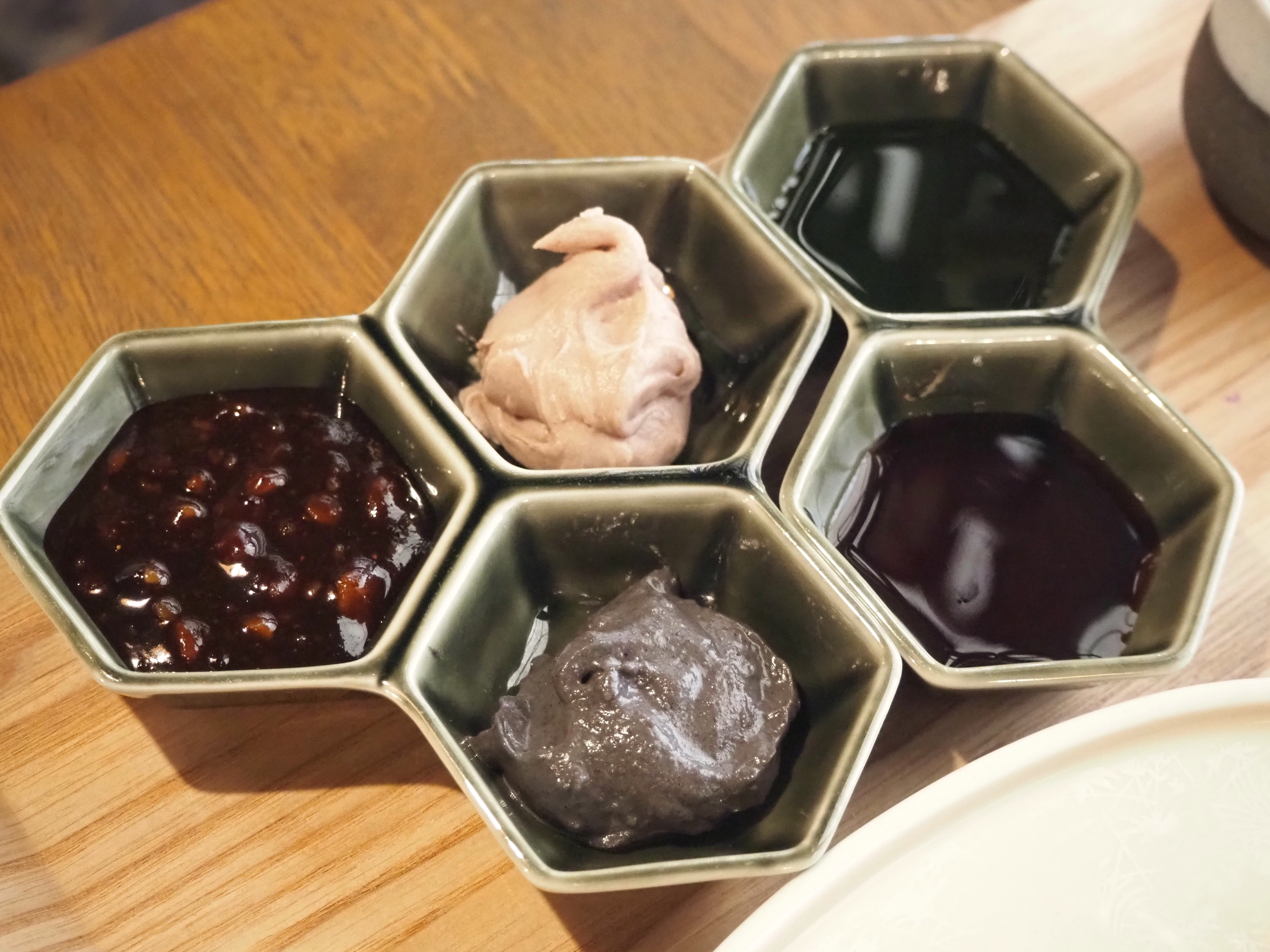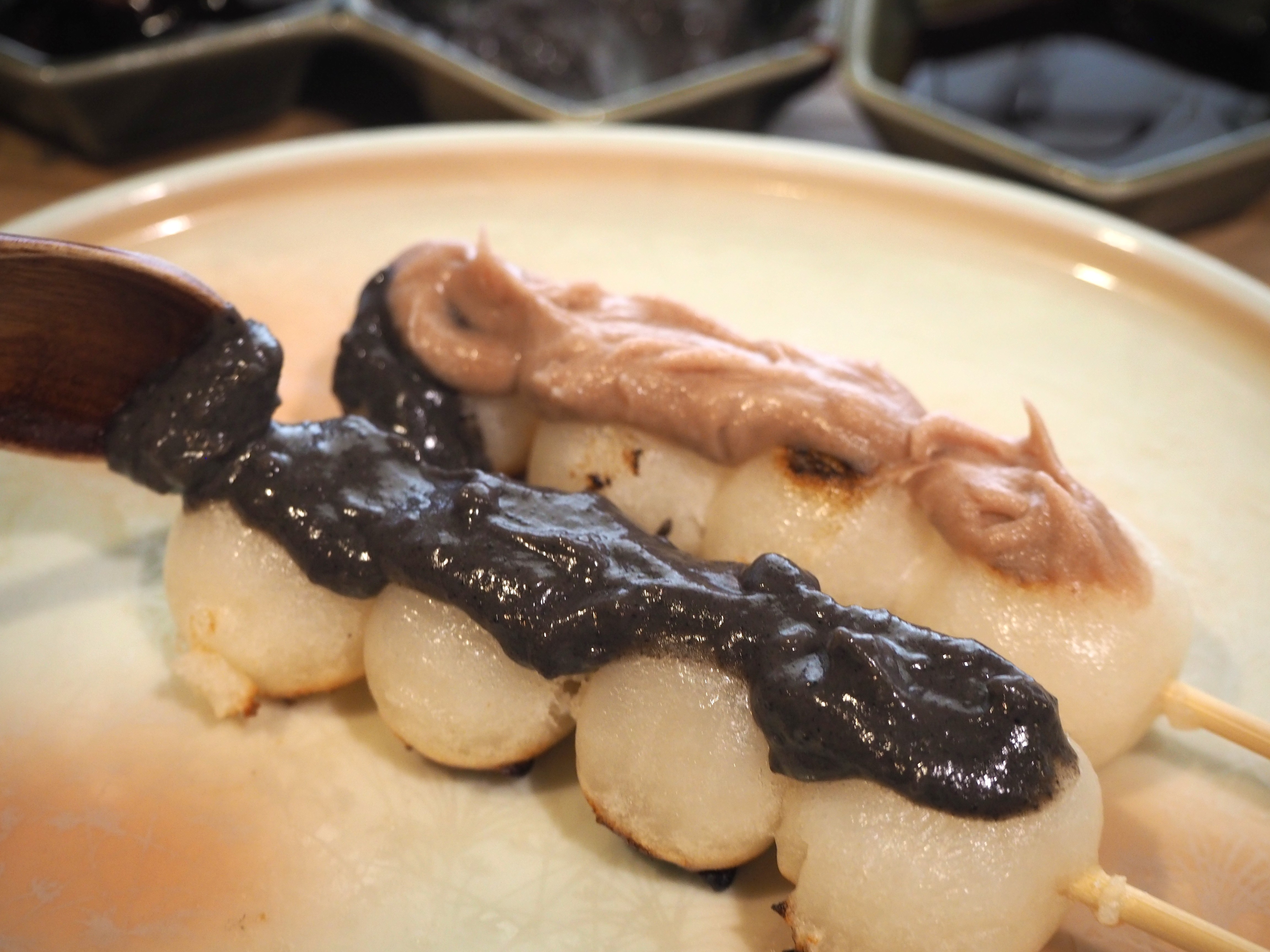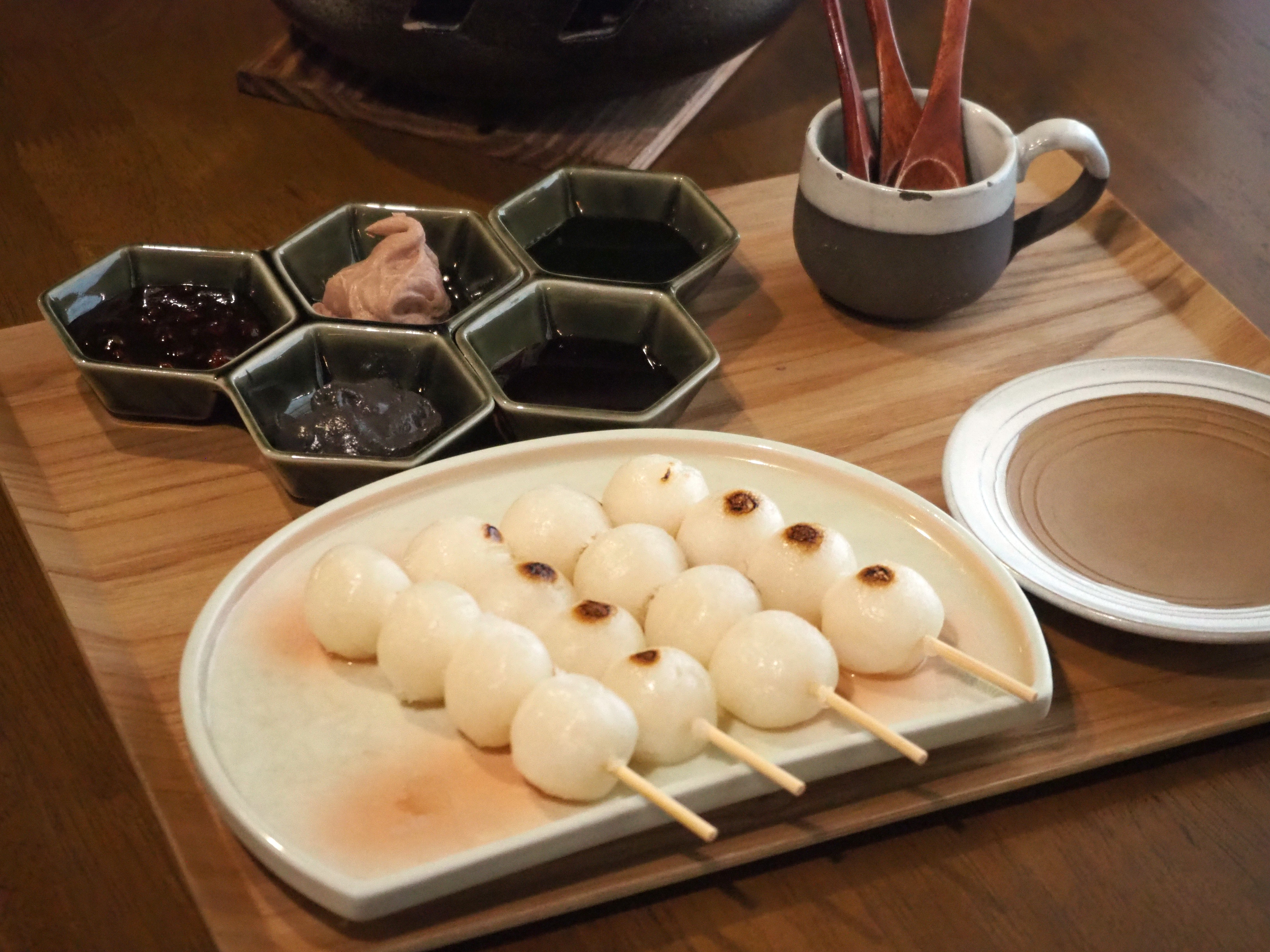 トッピングは、季節のあんとタレの5種類。この日は、粒あん、紫芋、黒ごま、みたらしソース、抹茶ソースが登場。自由にトッピングできるので、1本ずつ味を変えて、自分好みのお団子を作ることができます。