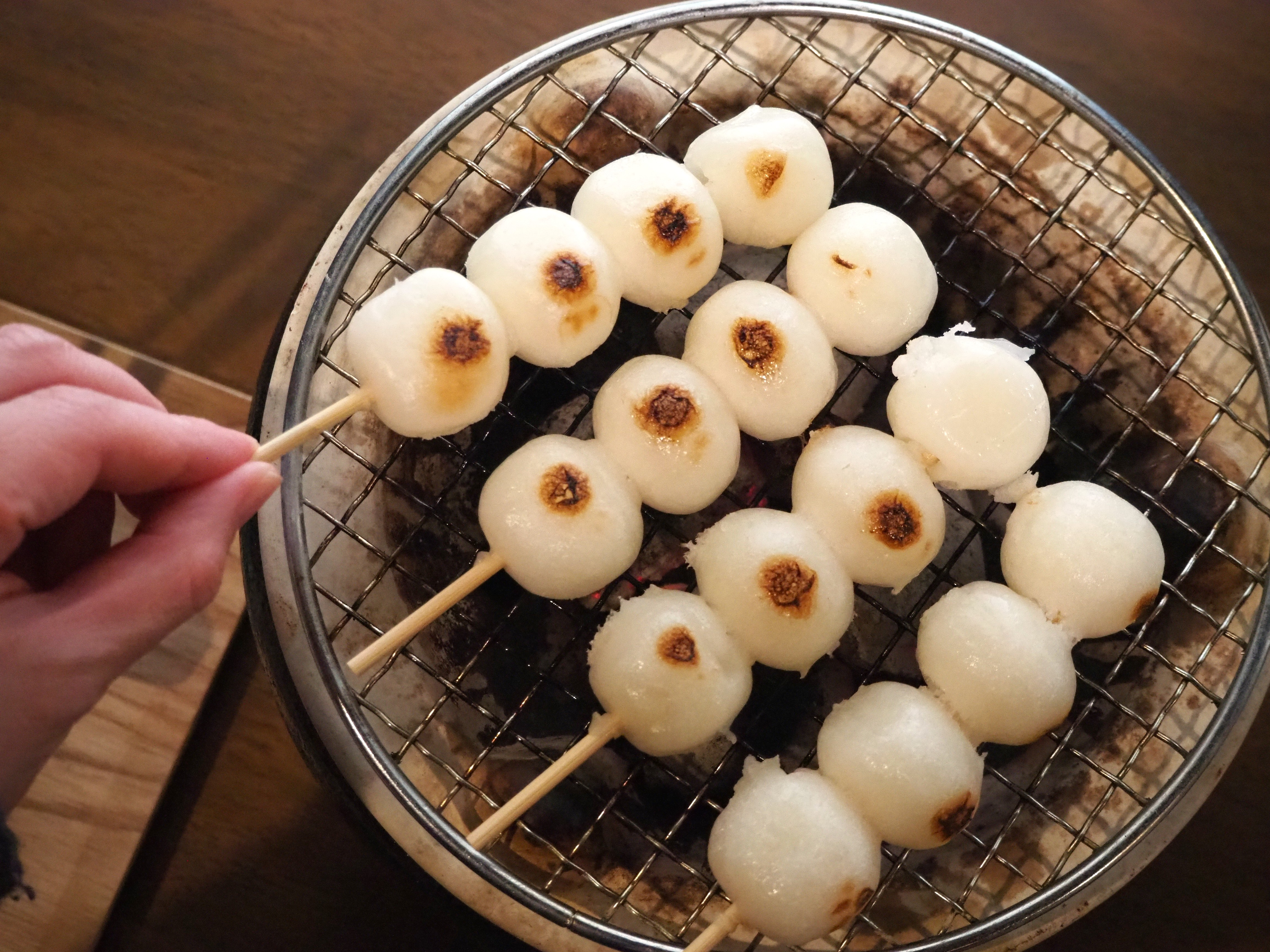 パチパチと弾ける炭の音。炭火によって、ほんのり焦げ目がついていくお団子。まんべんなく焼けるよう、網の上で団子の位置を変えるたび、香ばしい匂いが漂います。