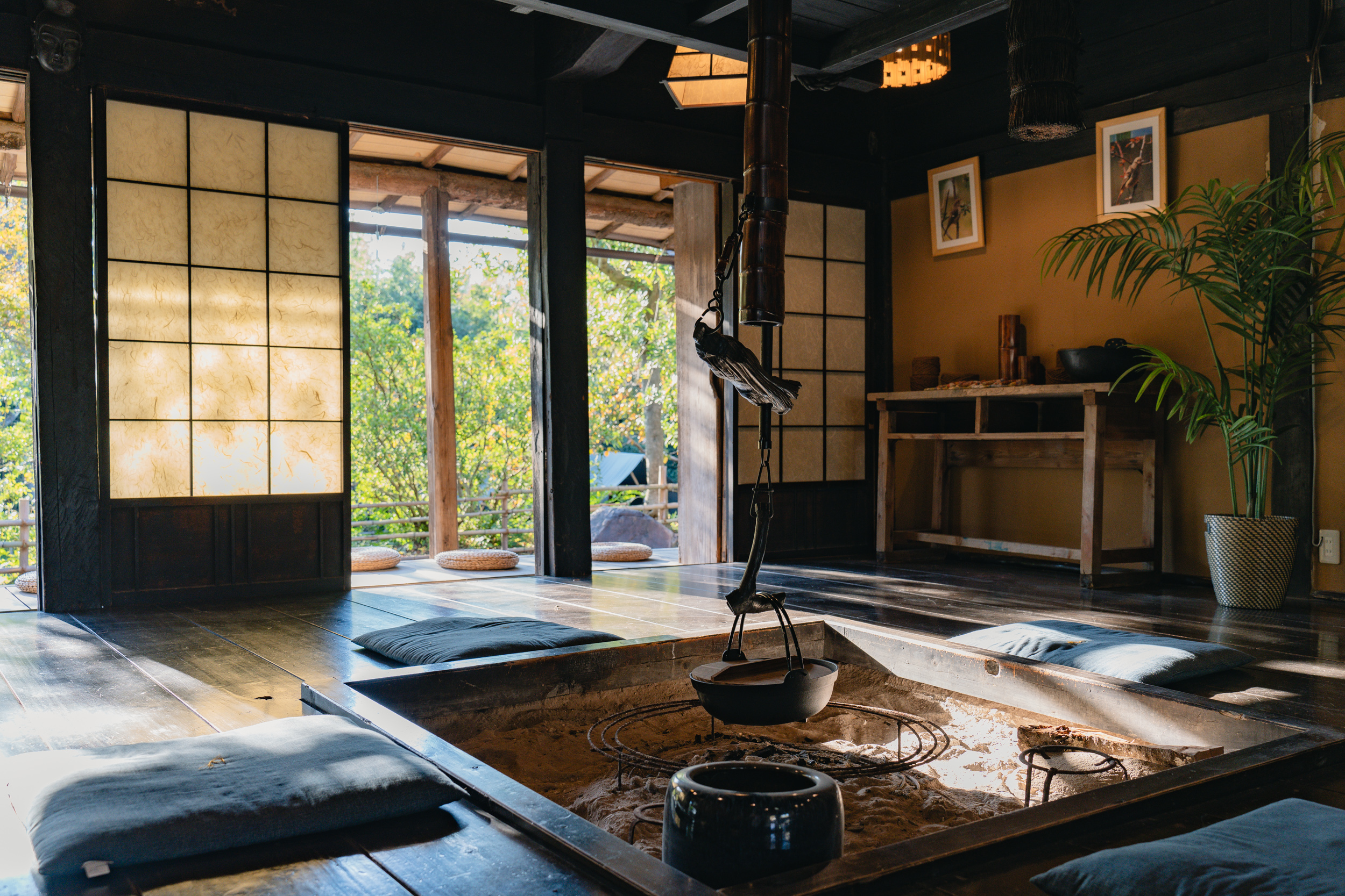 現在、1階は暖かさをキープするため、障子を閉めきっていますが、春は解放。爽やかな風を感じながら、鮮やかな緑色に変わった芝生と青空、山の自然を感じることができます。