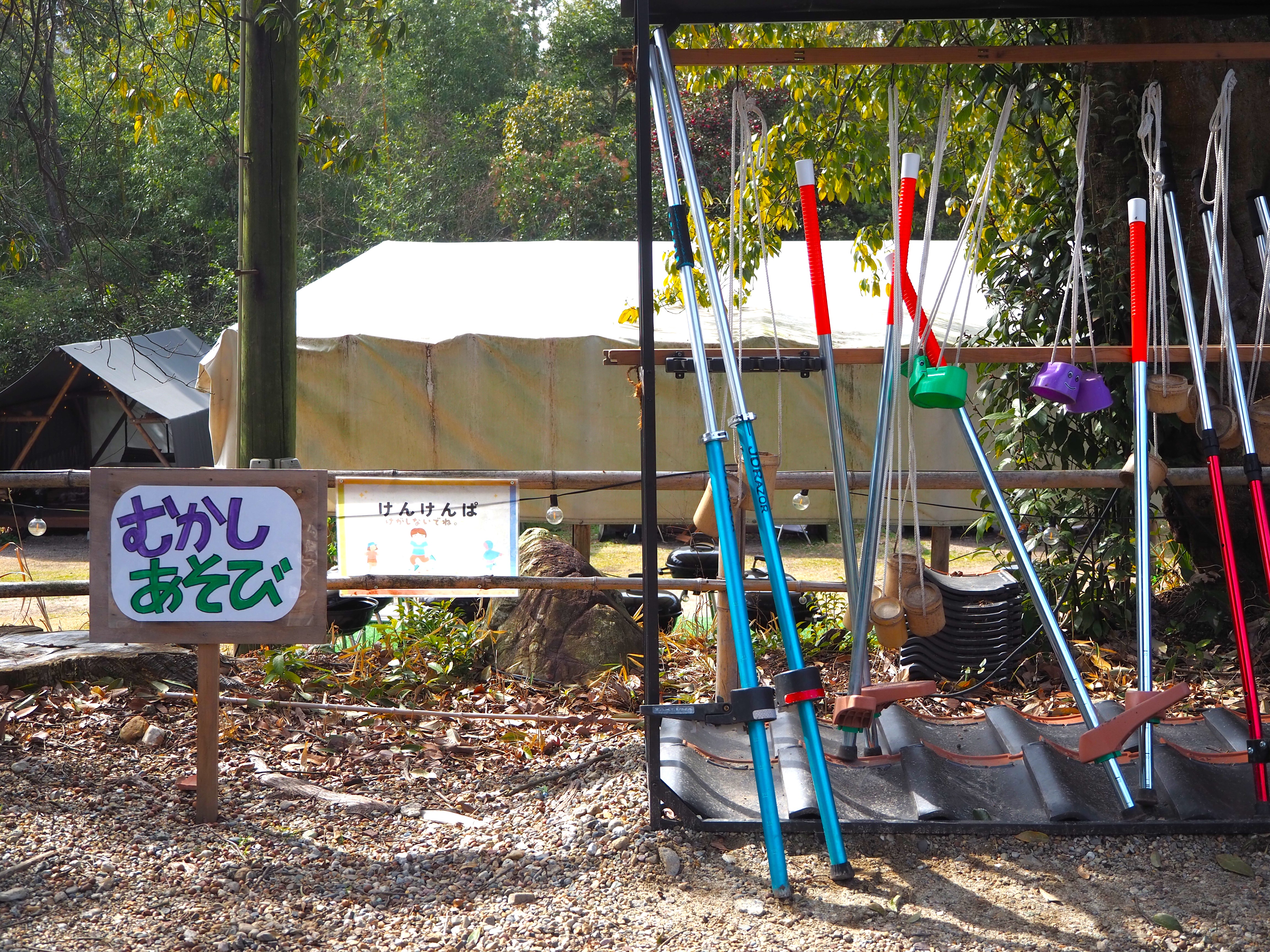 グランピング施設内にあることから、食事と合わせて、散歩やちょっとした遊びも体験できる『自然薯茶屋』。敷地内では、竹馬など懐かしい道具を使った遊びも楽しむことができます。