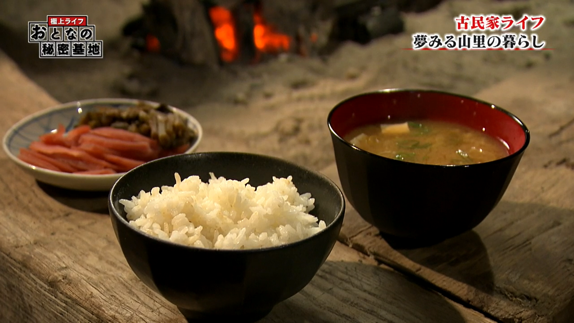 かまどの火が安定したら、客人たちのために食事の準備。地元で獲れた米と山から汲んだ水で炊くご飯。これが、このかまどの最初の仕事です。味噌汁に使うのは、たっぷりの地元野菜と手作り味噌。飛騨の漬物と共に、炊きたてのごはんと共に味わいます。