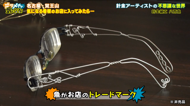 「手軽にすぐ思い通りの形が作れるところや、時間が経つ錆びたり変色したりしていろんな風合いが出てきて味が出てくるところが魅力」と話す合田さん。ご自身のメガネのつるも何と針金アートになっていました。ぶらさがった魚がなんともかわいらしいです。