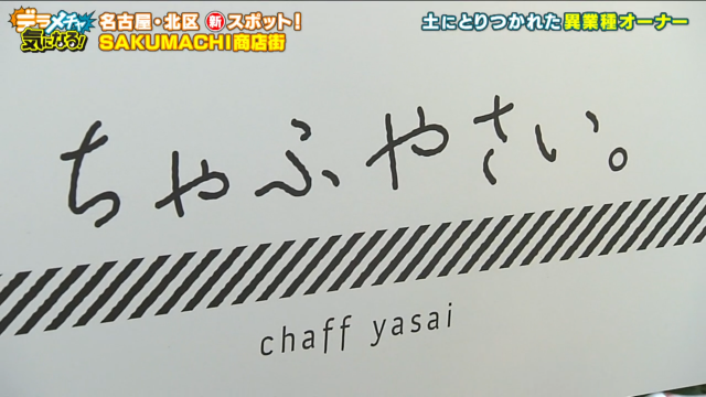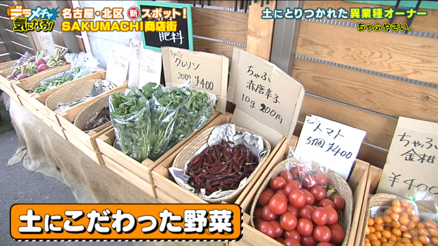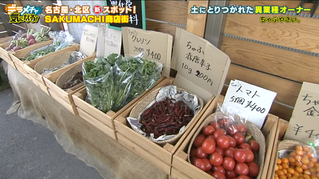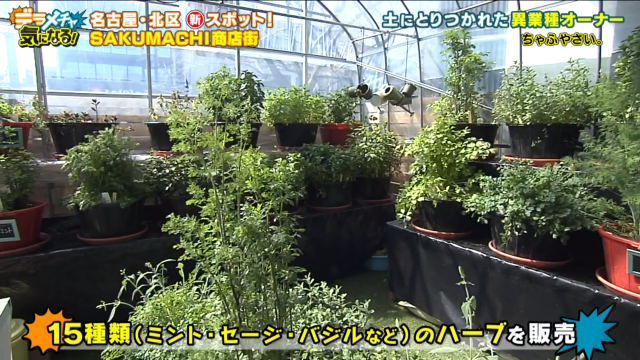 名鉄瀬戸線高架下に21店舗が立ち並ぶSAKUMACHI商店街。「商店街が出来たから明るくなった」と街の人が話します。そんな新しい商店街を歩き始めた二人が最初に訪れたのは、ガード下のビニールハウスが一際目立つ「ちゃふやさい」。ミントをはじめとした15種類のハーブや瑞々しい野菜などを販売するお店です。