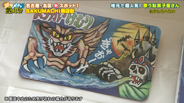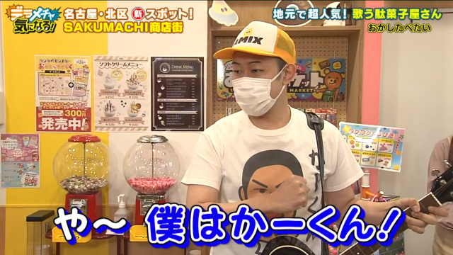 はるなが挑戦するも、残念ながら小さいあめ。子どもたちが引くと大当たりの大きなあめが当たりました。そんな「OKASHItabetai」にいるのが「カシタベモンスター」。お店オリジナルの駄菓子をキャラクター化したモンスターカードで、その数はなんと120種類以上になるとか。そんな「カシタベモンスター」を歌で紹介しているのが「かーくん」。近所の子どもたち曰く「大杉学区の辺りで人気」の有名人だそうです。今回は特別にかーくんご本人が登場です。