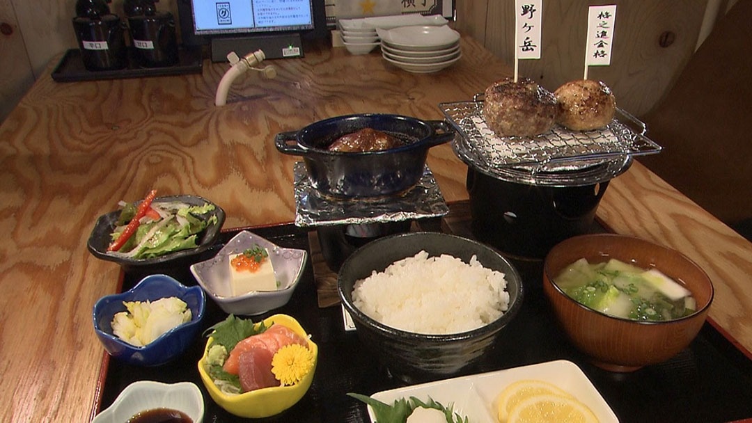 リモートの二人の前にもこのハンバーグ御膳が用意されていて、その豪華さにビックリ!ハンバーグにはそれぞれ個性的な名前が付いており、定番の『野ヶ岳』はピリ辛の担々ラー油でいただくのがオススメだとか。渚は「スゴイ肉食べてるって感じですね。脂が甘い気がするのでこのピリ辛に合ってると思います」とナイスな食レポ。