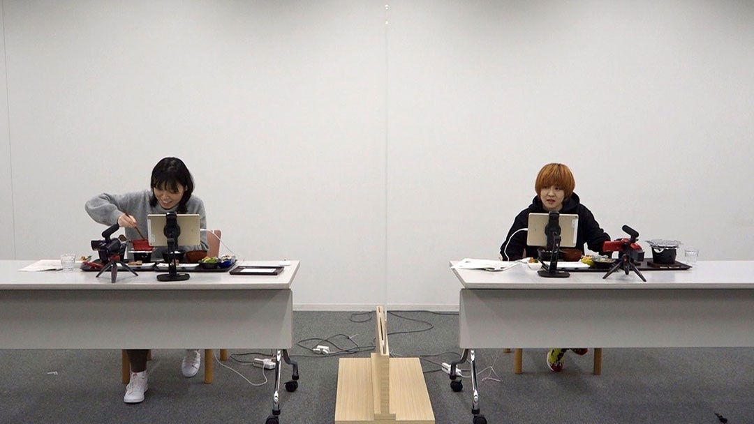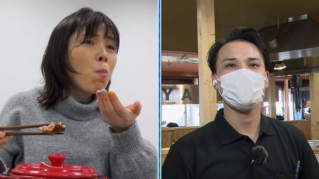 2020年12月にオープンした、5軒のお店が集まる『一宮グルメ横丁』。画面越しに店舗のマネージャーさんと二人はご対面。ここは、ハンバーグ、カフェメニュー、焼き肉、海鮮、ラーメンと5つのお店が集まっていて、どの席からも全てのお店のメニューが注文できるというフードコート形式の店舗とのこと。