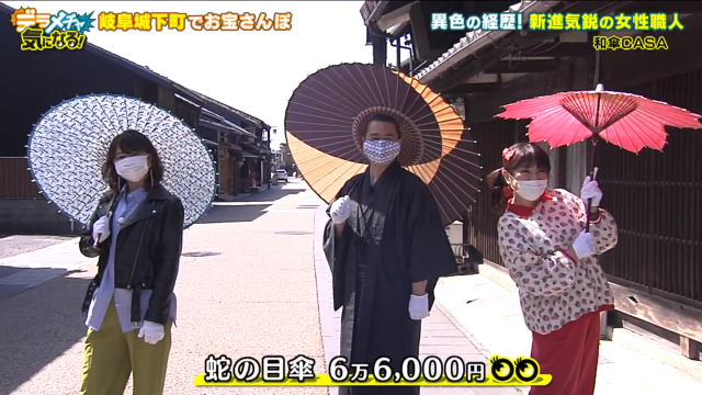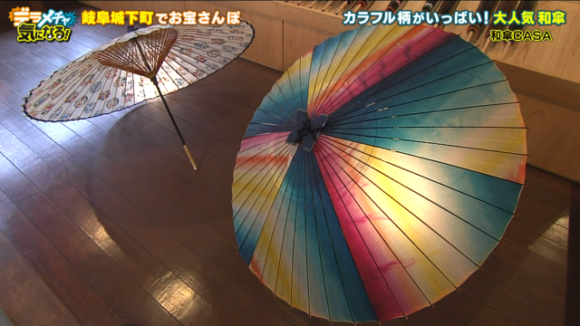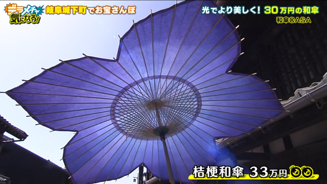 岐阜はもともと林業が盛んで長良川を伝って木の工芸文化が広がったということもあり、今でも提灯や和傘が作られているそうです。「やっぱりそれが岐阜の宝」と柴田さんが熱く語っていました。そのあと二人は、お店で最も高価な和傘を見せて貰うことに。
