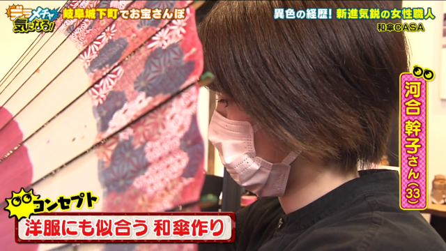 「桜だー!」と叫んだ村上でしたが、実際には桔梗のデザイン。光が当たると空が透けて見えるような、とても素敵な和傘です。骨組みから染めまで全て職人の手によって丁寧に作られた和傘、30万円というお値段も十分納得です。そんな素敵な和傘を作ったのが「洋服にも似合う和傘を作りたい」と話す河合幹子さん。今注目を浴びる新進気鋭の和傘職人です。