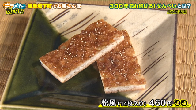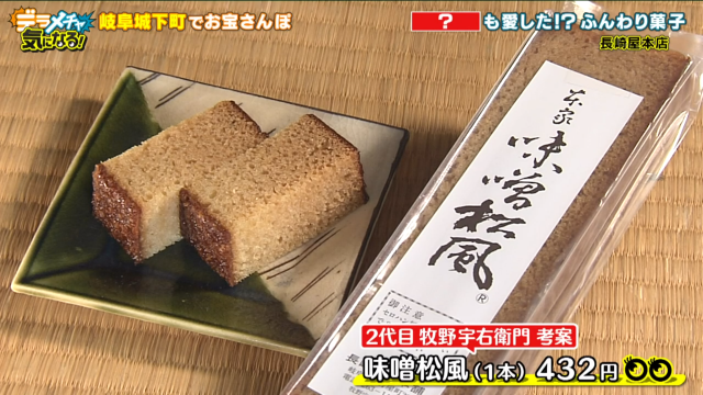 およそ250年前に2代目が考案した味噌松風は夏目漱石も好んだそうで、なんと小説の中にも味噌松風の名前が登場するとか。カステラのような見た目ですが、玉子を使わないなど材料が異なるとのこと。茶色の端の部分に味噌の塩味が感じられ、味噌のコクで黒糖のような風合いになっています。この味にはるなも「めちゃめちゃおいしい!もっちり!」と唸っていました。これもまた、守り続けていきたい岐阜の宝の一つです。