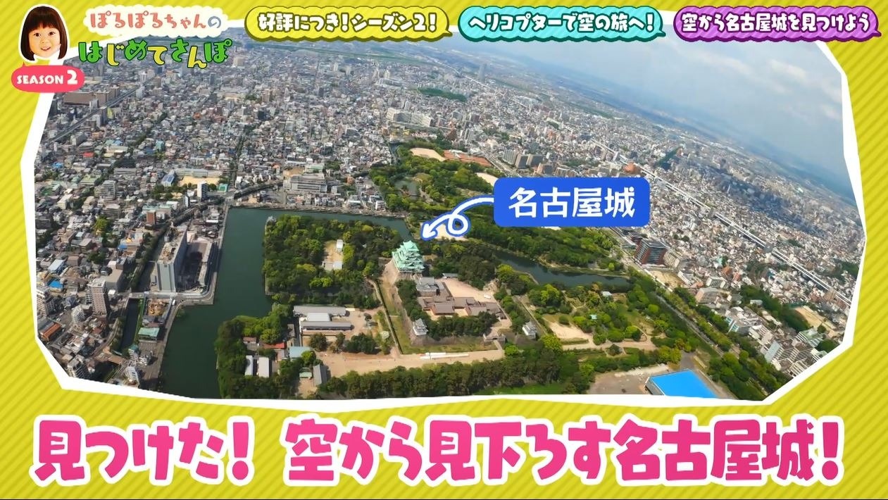 しばらくすると名古屋城を発見!「おしろだ~!ヤッホー」と声をかけるぽるぽるちゃん。優雅な空中さんぽを満喫します。