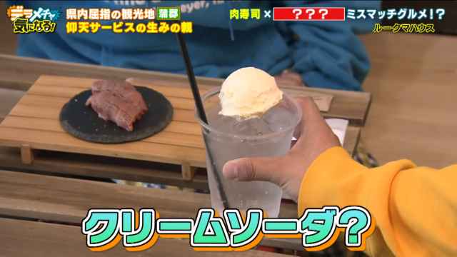 なんと何と、クリームソーダを運んで来るではありませんか。肉寿司とクリームソーダの仰天セットを目の当たりにし、はるなも村上も目をパチクリとさせてしまいます。