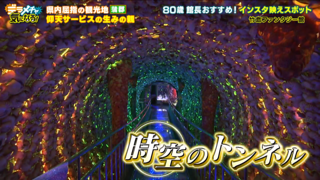 貝が張り巡らされたトンネルに鮮やか光が!その幻想的な光景に思わずうっとりしてしまいます。なんと総工費はおよそ1000万円!トンネルの真ん中ぐらいに立って、写真を撮るのが杉浦館長のオススメです。