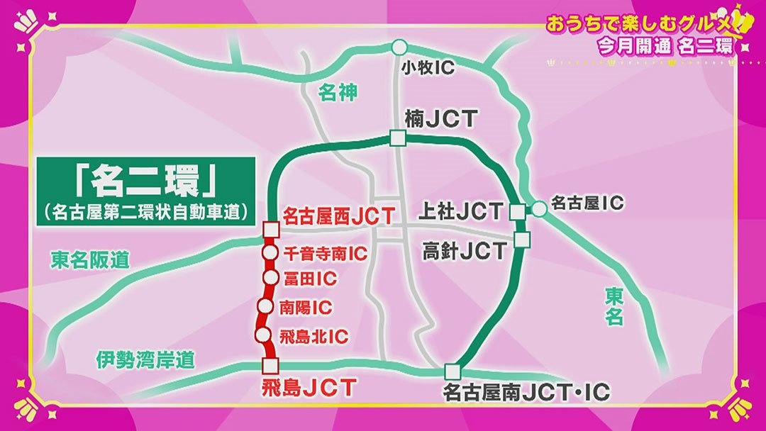 略して『名二環(めいにかん)』は名古屋市周辺を1周する道路で、今回繋がったのは、名古屋西ジャンクションから飛島(とびしま)ジャンクションまでのおよそ12.2キロ。その間にはインターチェンジが4ヶ所あり、市内の渋滞が緩和され、移動もかなり便利に。