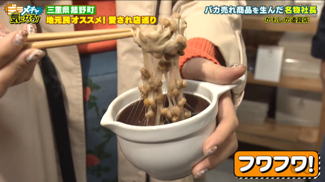 納豆を混ぜるための専用の器『なっとうバチ』です。この器で納豆を混ぜると、器の内側につけられたかすかな溝の効果で納豆に空気が入り、フワフワになるとのこと。さらに器の形も混ぜやすく洗いやすいように計算されています。最初は「これ、いりますー?」と首をかしげていたはるなでしたが、山口さんの説明に興味津々。早速体験です。