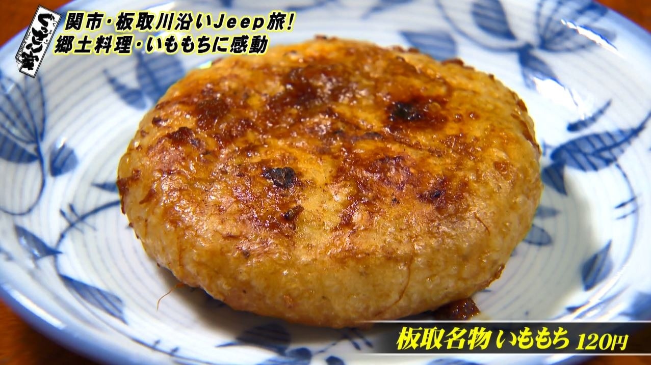 『板取名物いももち』(120円)は茹でた里芋とご飯を潰しながら混ぜ合わせ、丸く形を整え、両面に生姜醬油をたっぷりつけて、こんがりきつね色になるまで焼き上げた郷土料理。「生姜醬油がめちゃめちゃいい香り。ずっと嗅いでいたいな」と期待が高まります。