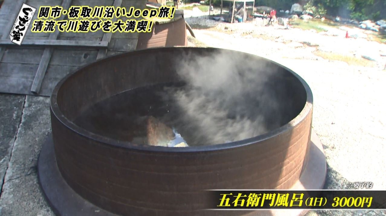 最後は、もうひとつの『板取キャンプ場』名物『五右衛門風呂』(1日 3000円 ※要予約)で体を温めます。川遊びで冷えた体がじんわり温まり最高の気分♪大自然の中、板取川沿いのドライブ旅で夏の一日を楽しんだぐっさんでした。
