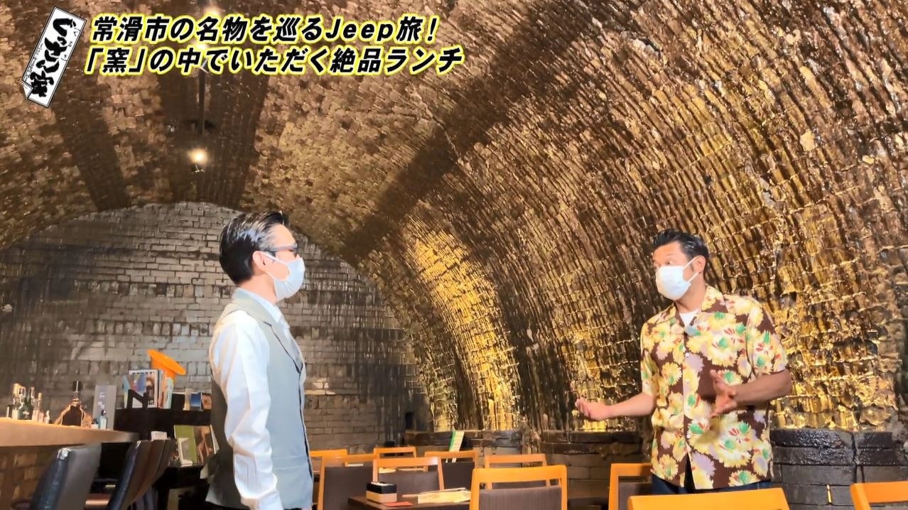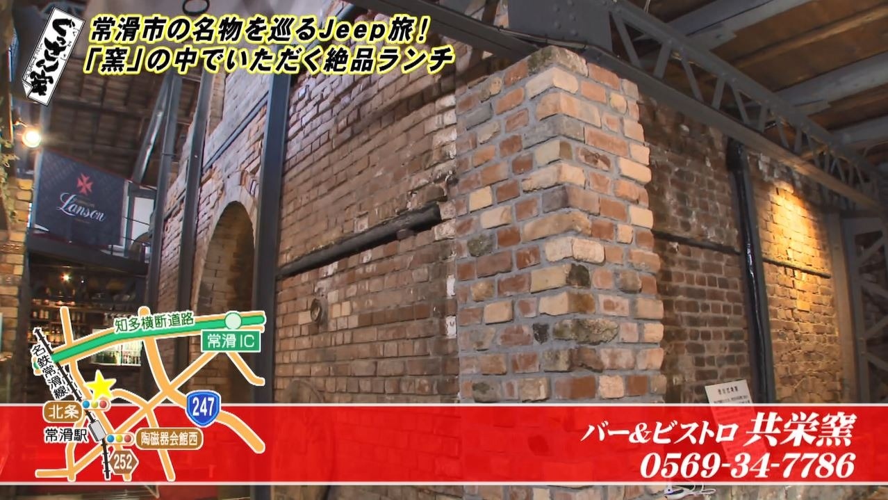 「常滑、僕好きなところです!」と愛車のJeepを走らせ、まずやってきたのは『バー&ビストロ 共栄窯』。「うわっ渋いな。レンガ造りの。かっこいい!なんかテーマパークみたい」と興味津々のぐっさん。