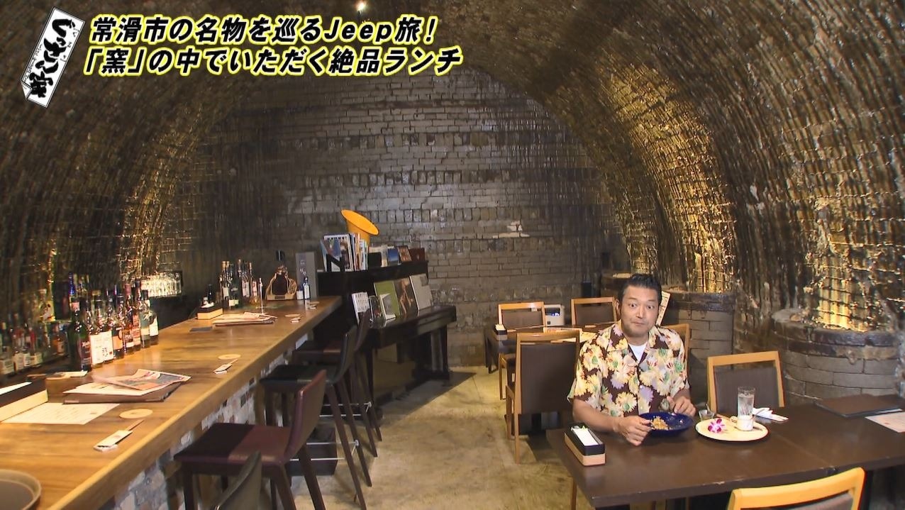 「めっちゃおしゃれ!これ(窯)自体が焼き物ということ?すべてが結果としてかっこよくなっていますね」と興奮気味のぐっさん。客席はレンガ造りのトンネルのような空間にバーカウンターとテーブルが並び、雰囲気抜群です。