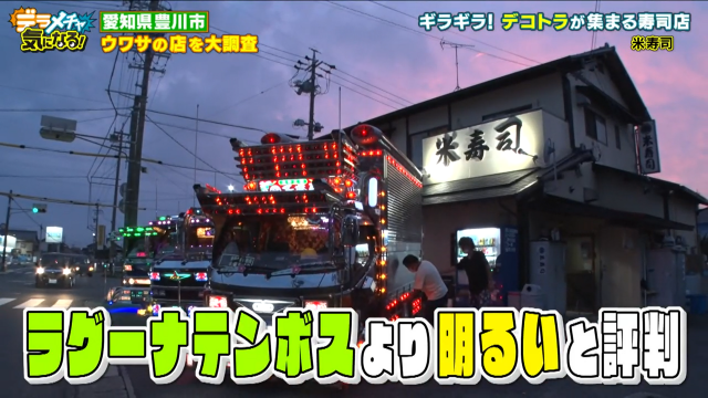 最後に検証する豊川市のウワサは「ギラギラすぎるお寿司屋さんがあるらしい」。ネットでも「ラグーナテンボスより明るい」「夜になると超カラフル」と気になる情報がいっぱいです。そんなウワサを尋ねて三人がやってきたのは米寿司さん。しかし、一見するとギラギラ感はない普通のお寿司屋さんです。