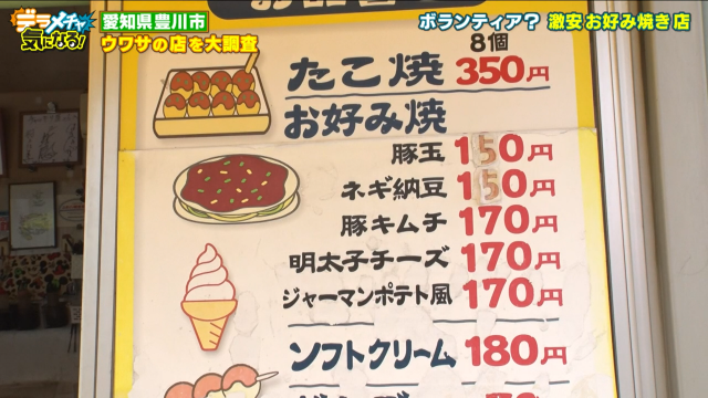 コメント:お好み焼きが全品200円以下で買えるお好み焼き店。連日行列ができるほど大人気で、1日300枚以上売れる。
